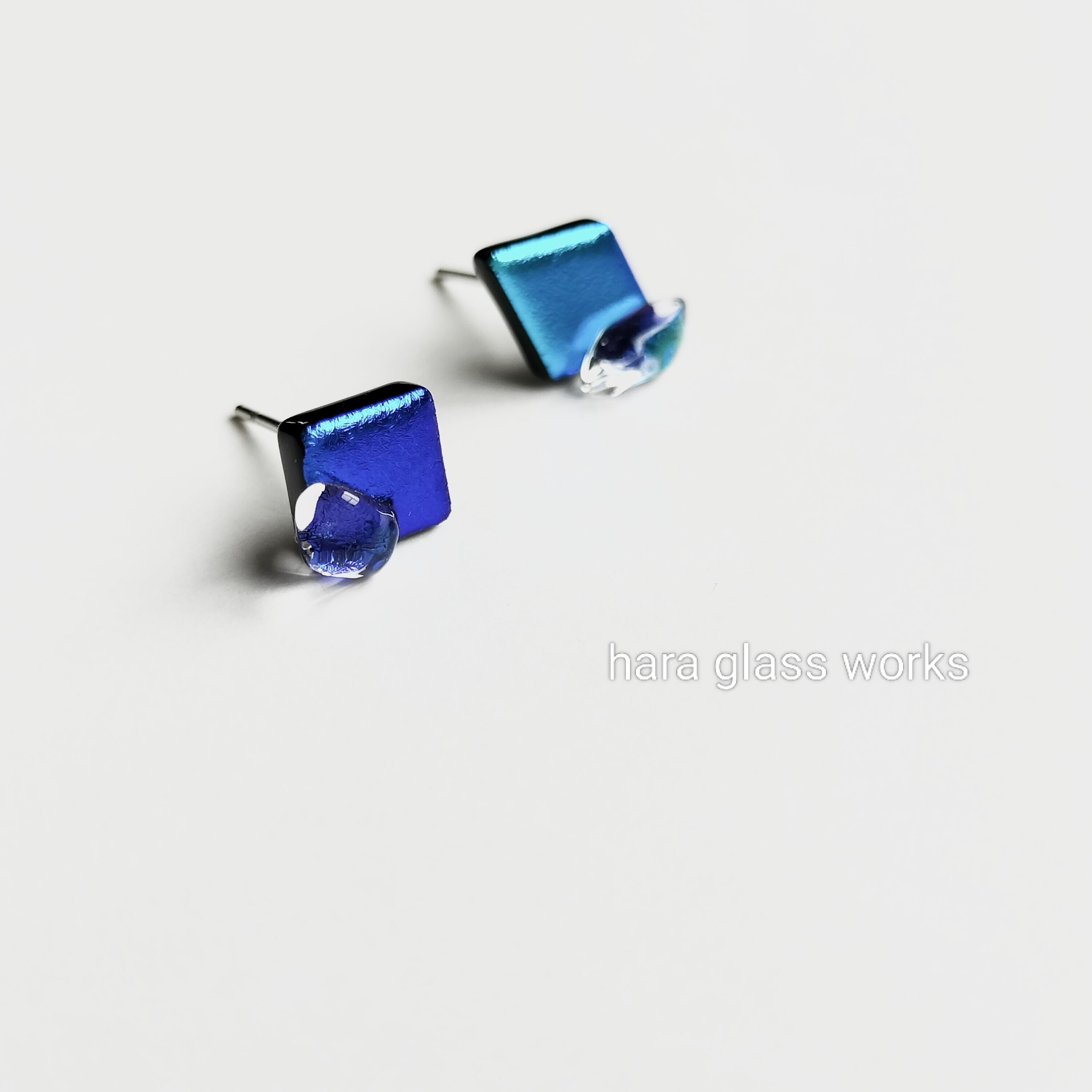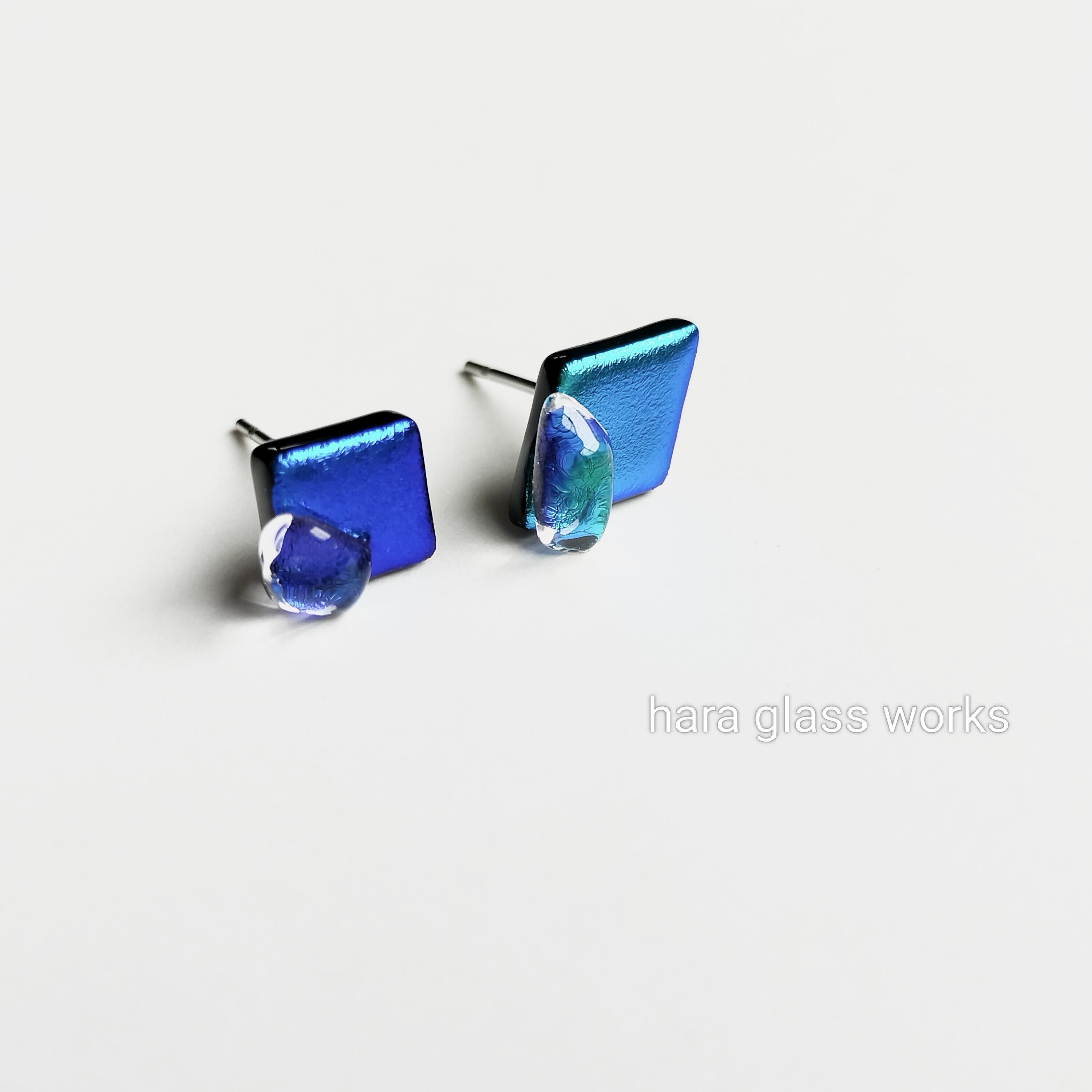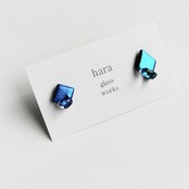 ◆■▲の小粒のアシンメトリーガラスのピアスです。ブルーの色違い&形違いを組み合わせました。キラキラ部分を表にした、マットに輝くデザインです。