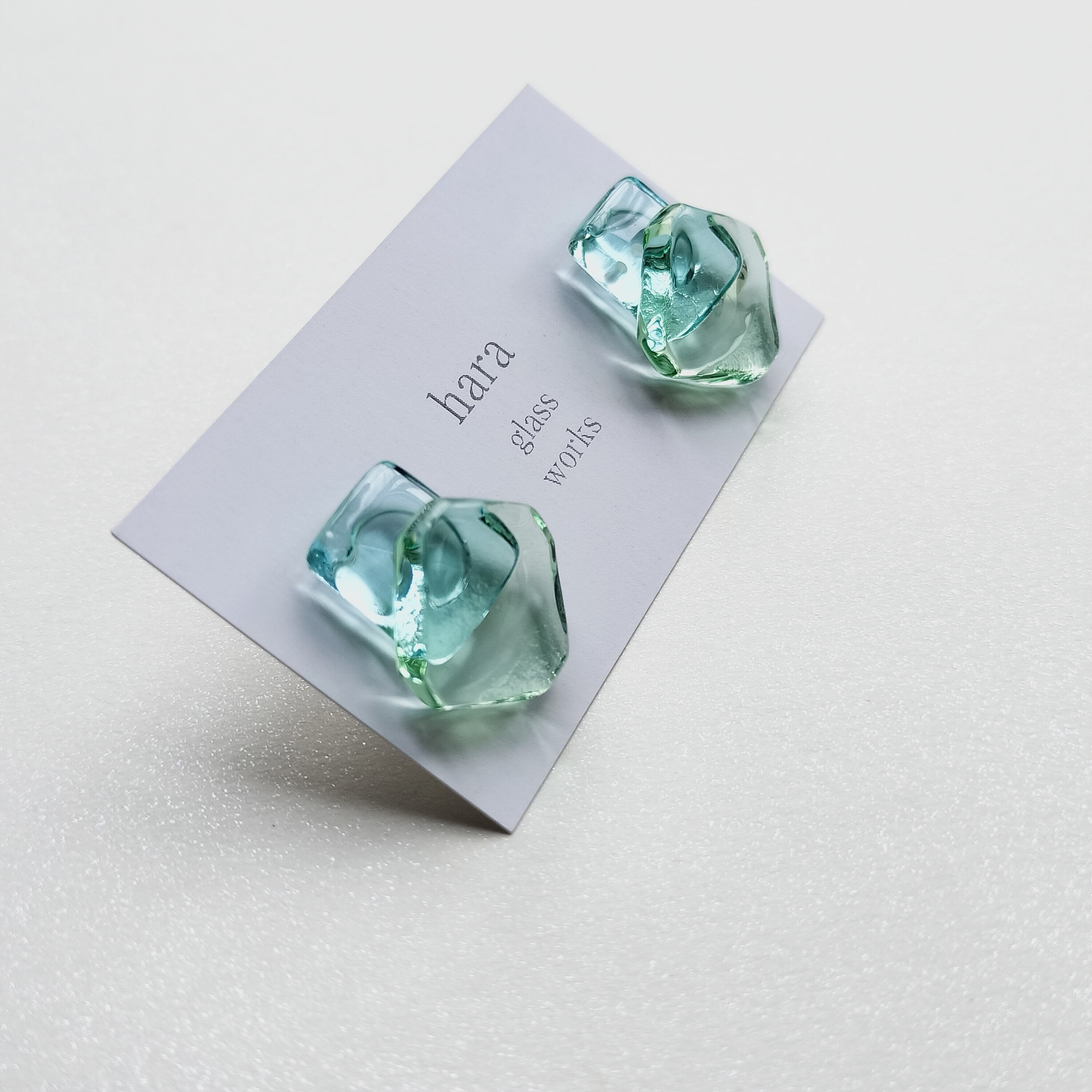 ラムネの瓶みたいな淡いティントグリーン&ティントブルーで作成したガラスピアス/イヤリングです。
