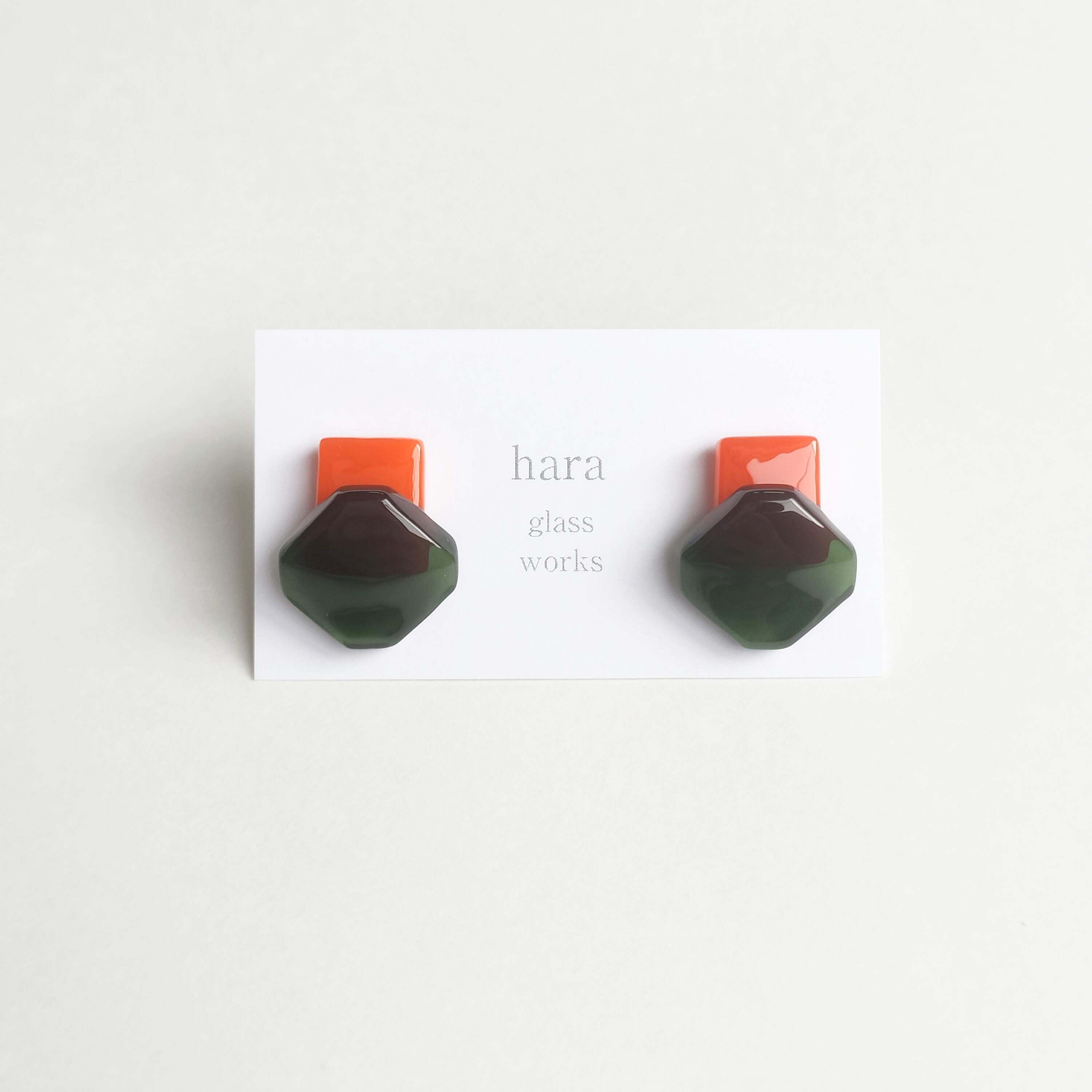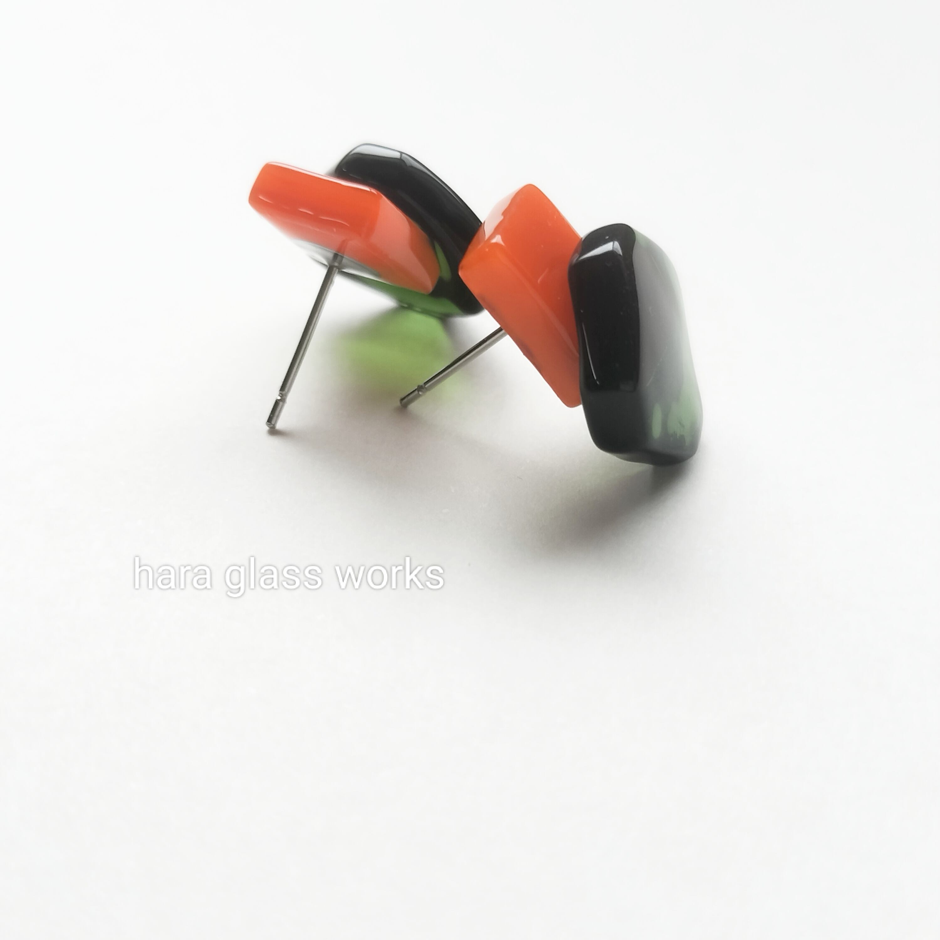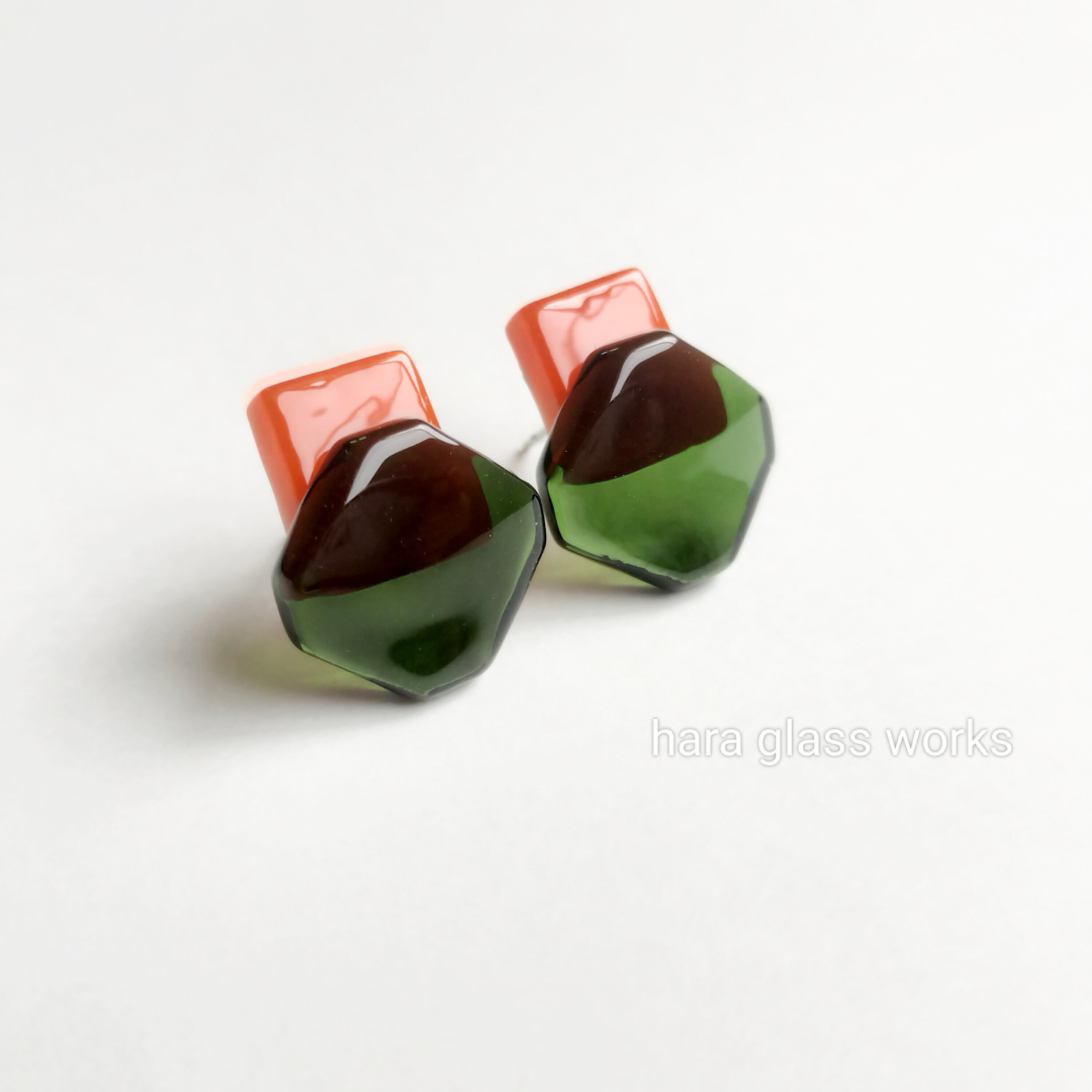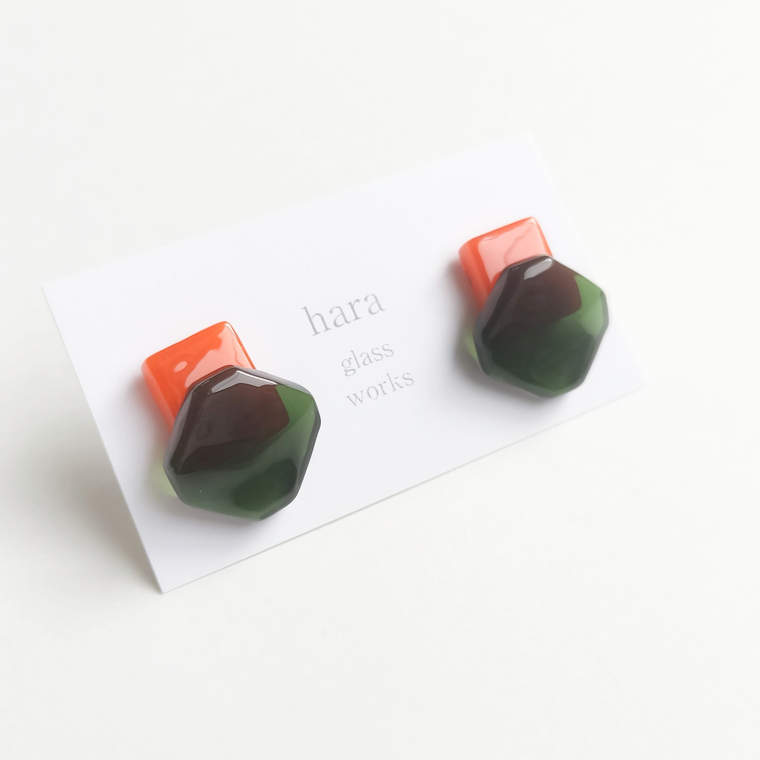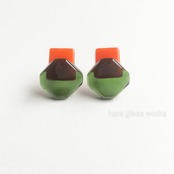 ○□ガラスピアス モスグリーン&オレンジ アレルギー対応ピアス/イヤリング選択