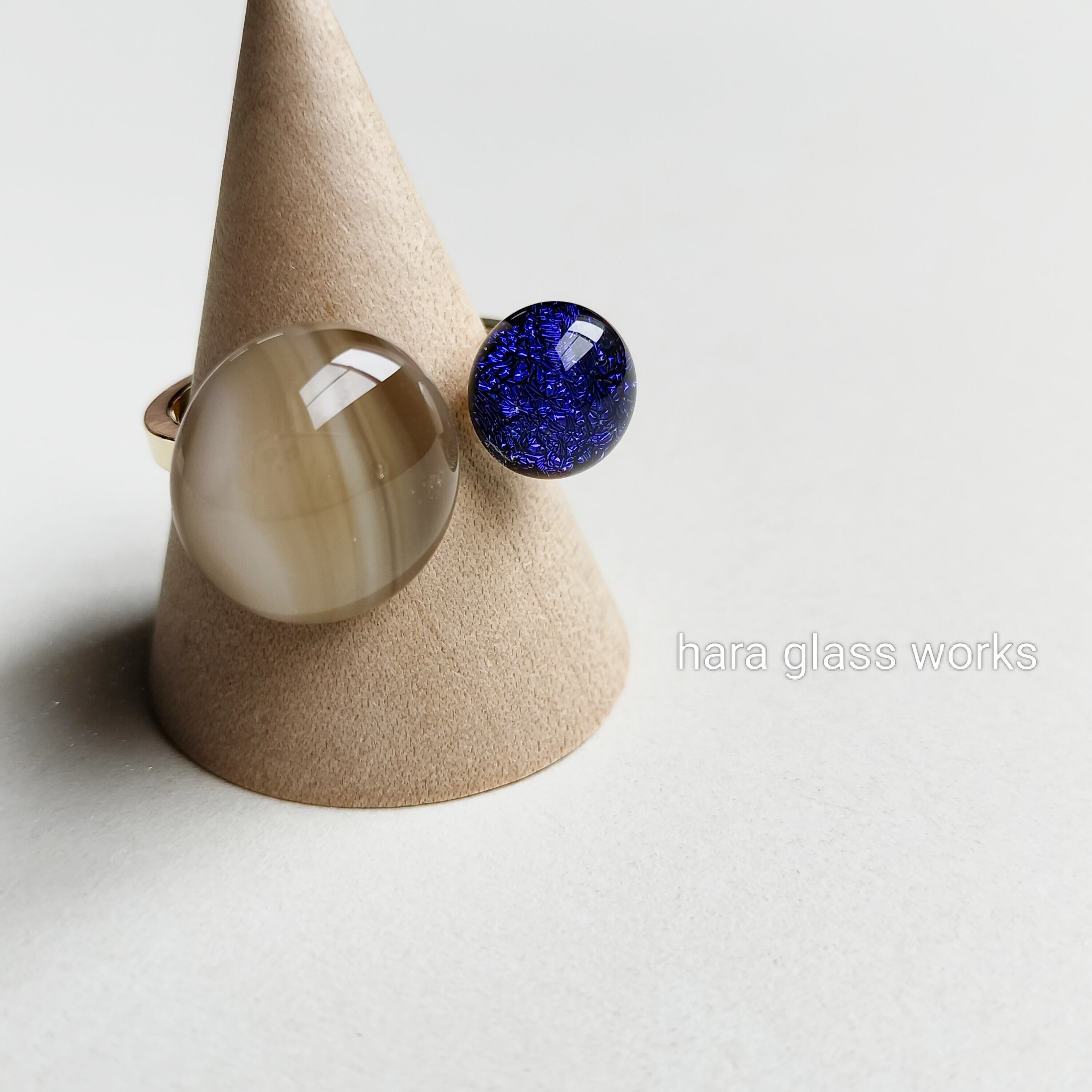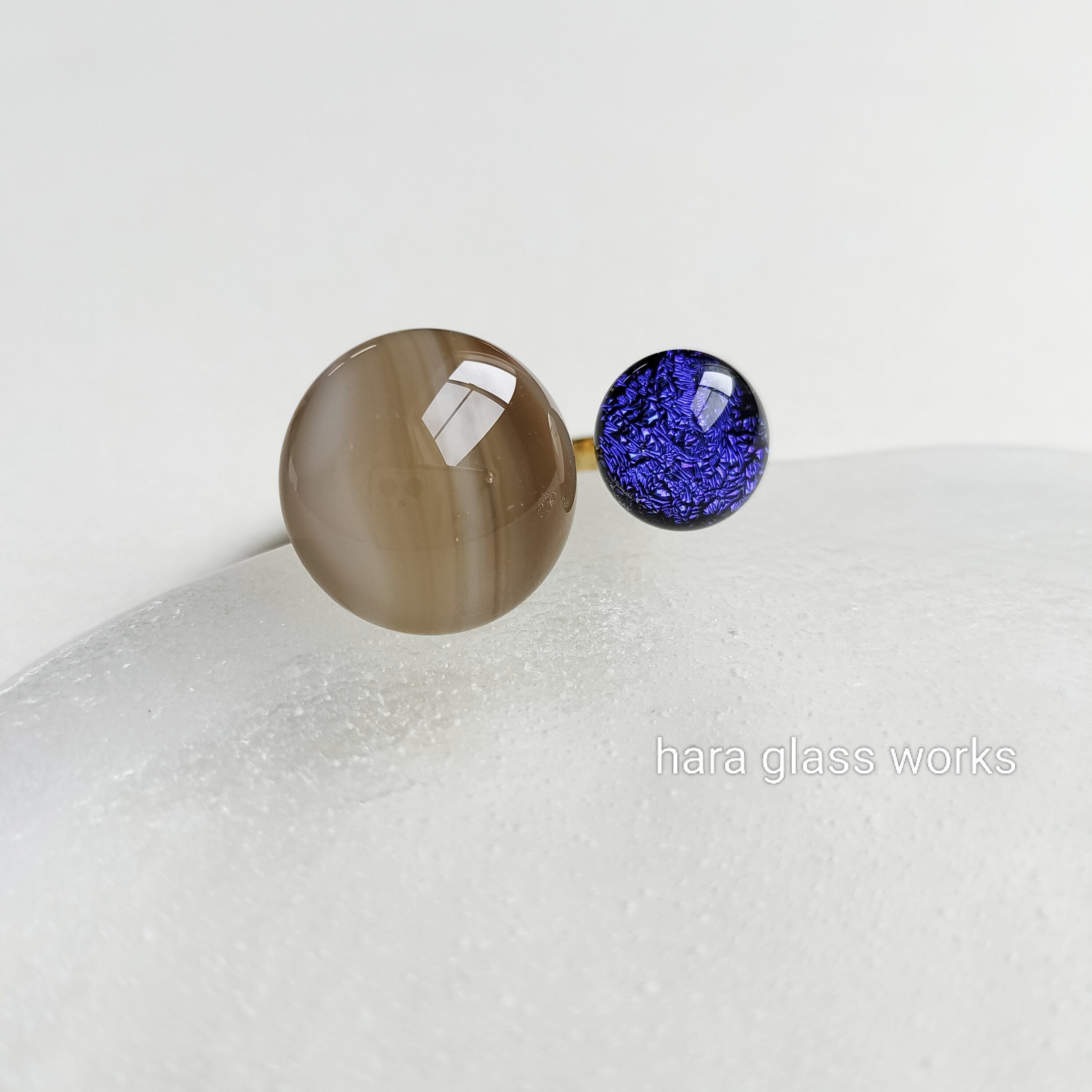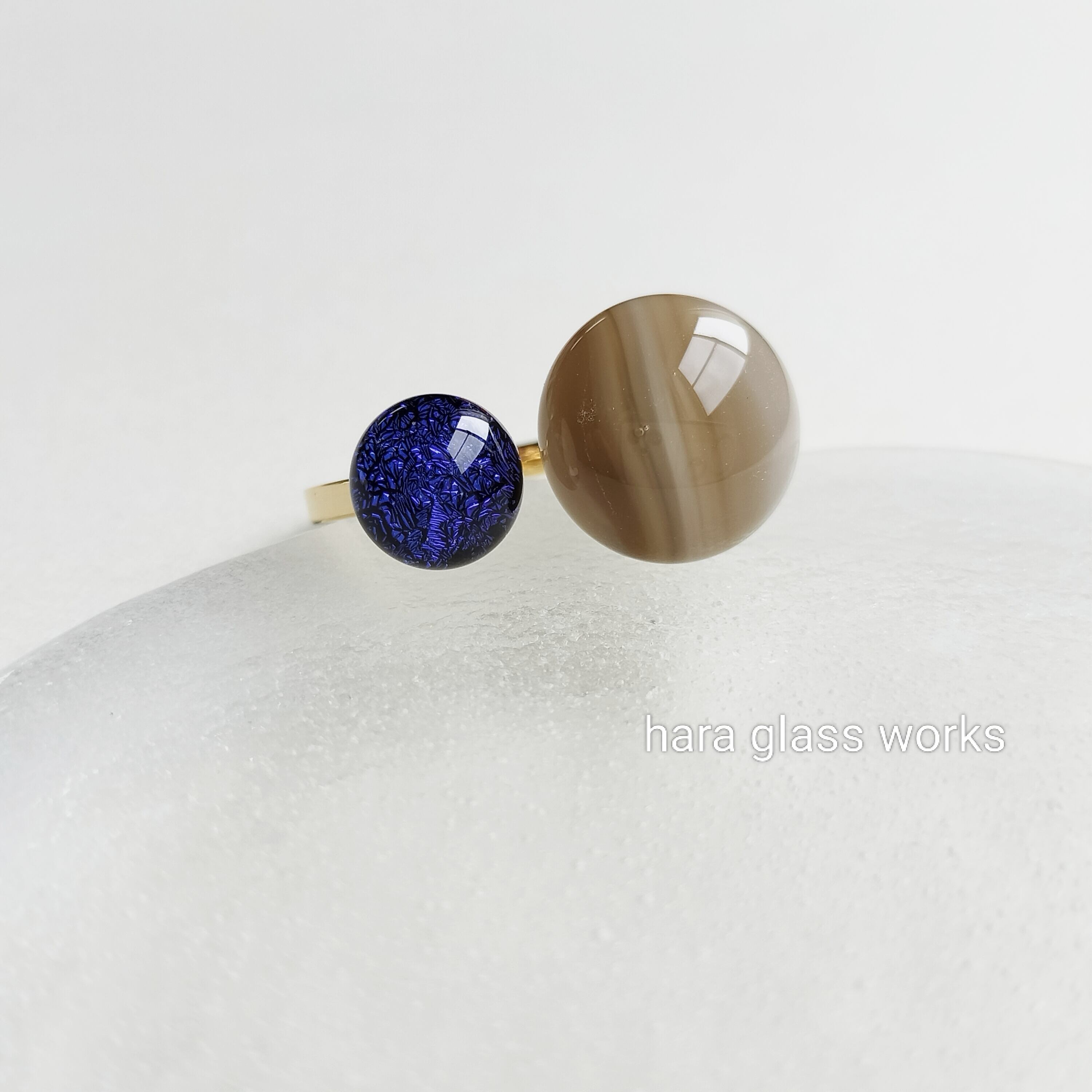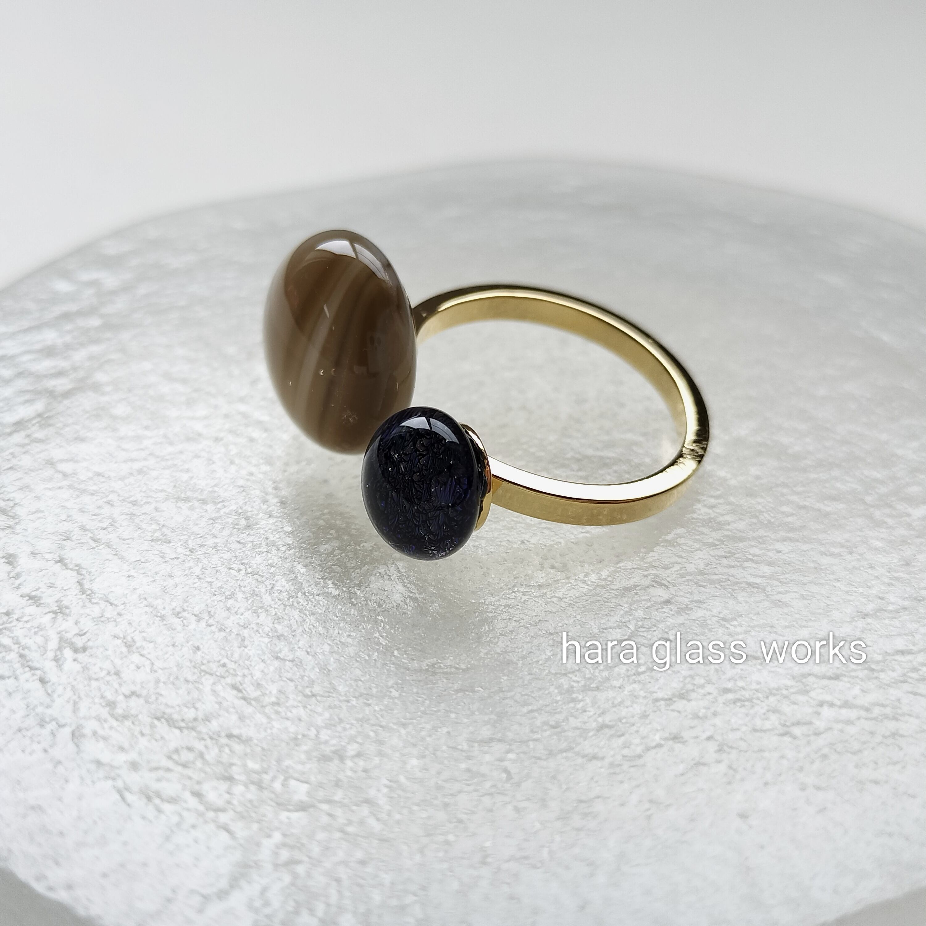 一つのリングで2つのガラスを楽しめるフォークリング。ストリーキー(グラデーションガラス)とキラキラに光るブラックベースのオーロラガラスを組み合わせました。