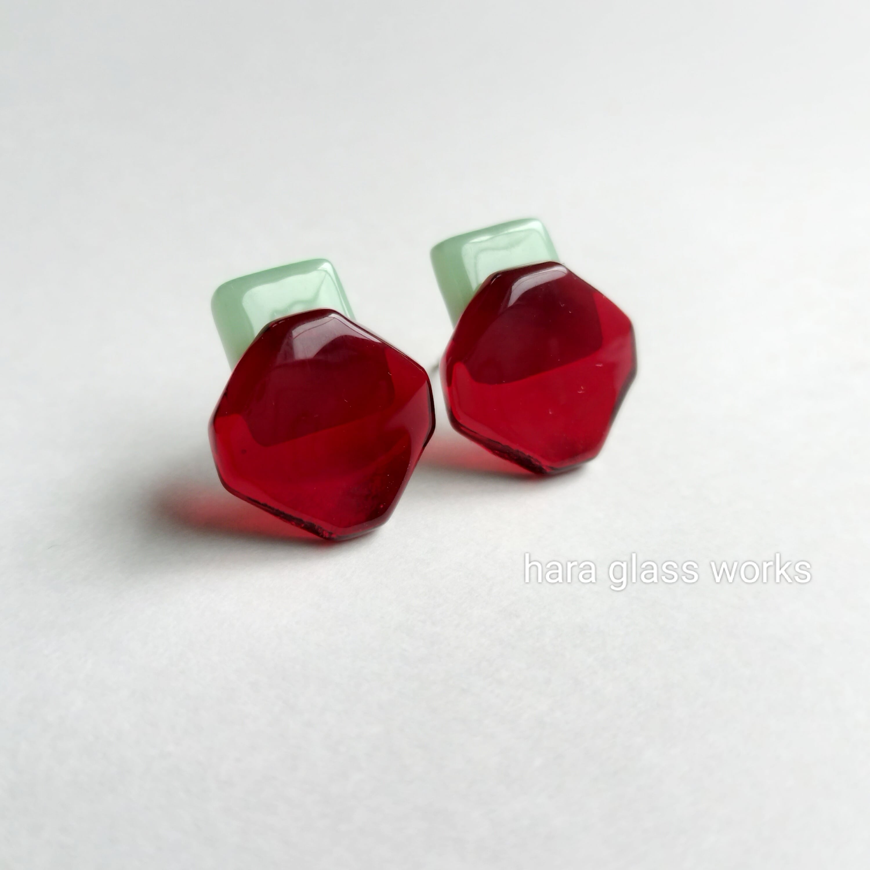 ○□ガラス トマトレッド&ミントグリーン アレルギー対応ピアス/イヤリング選択