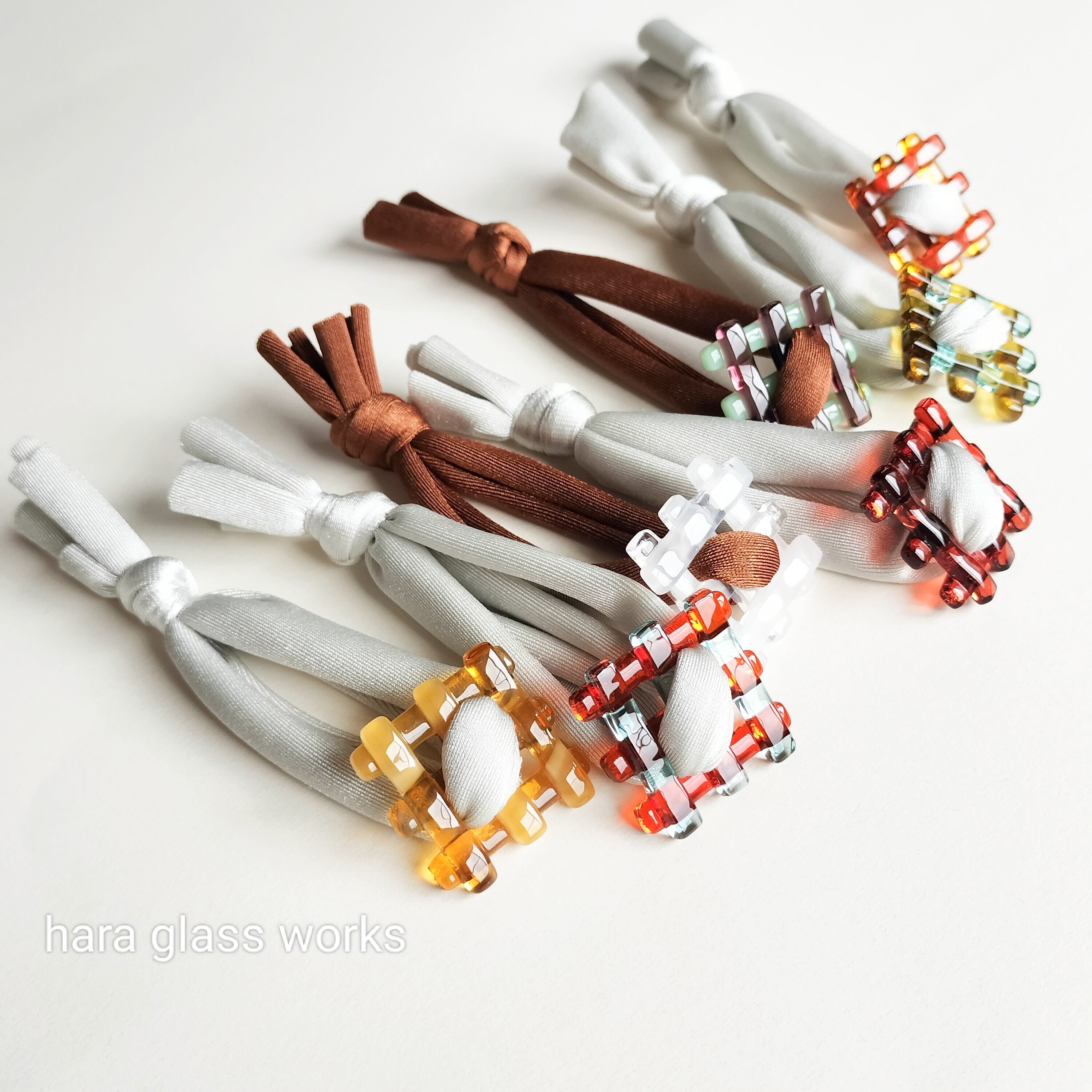 ミントグリーン&プラムカラーがかわいいチェック(格子)ガラスのヘアゴムです。光沢と伸縮性のある布を割いてゴム部分に使いました。