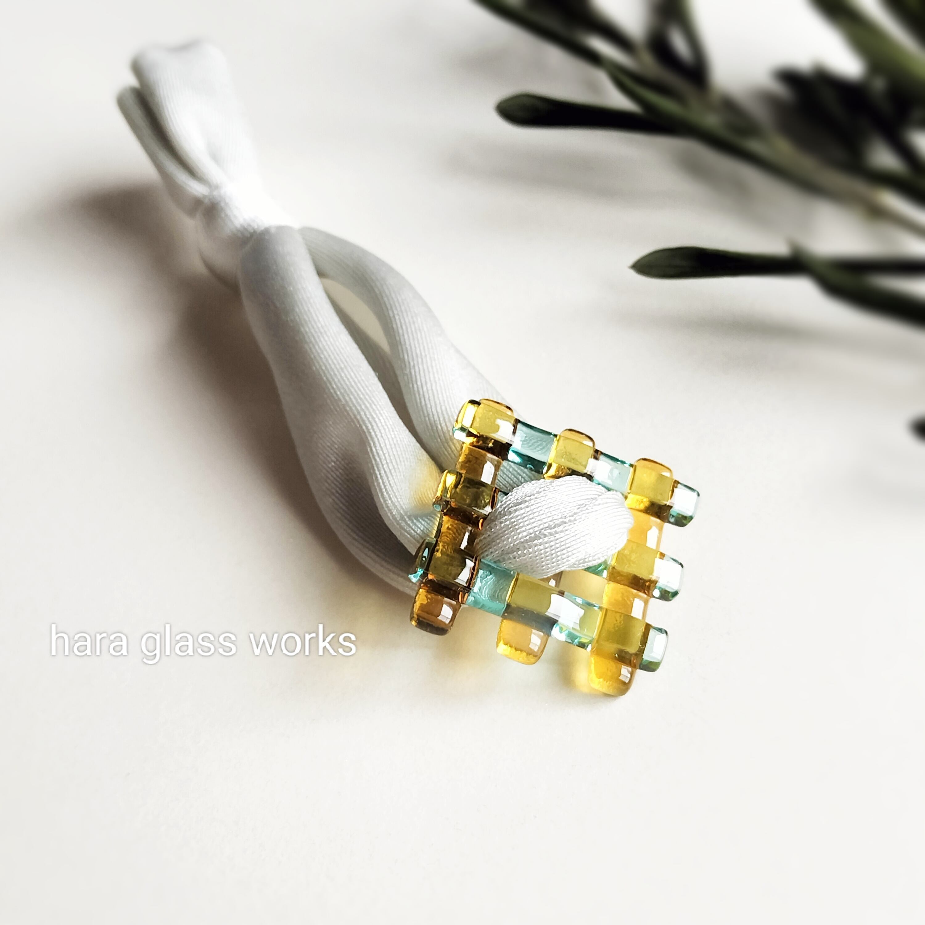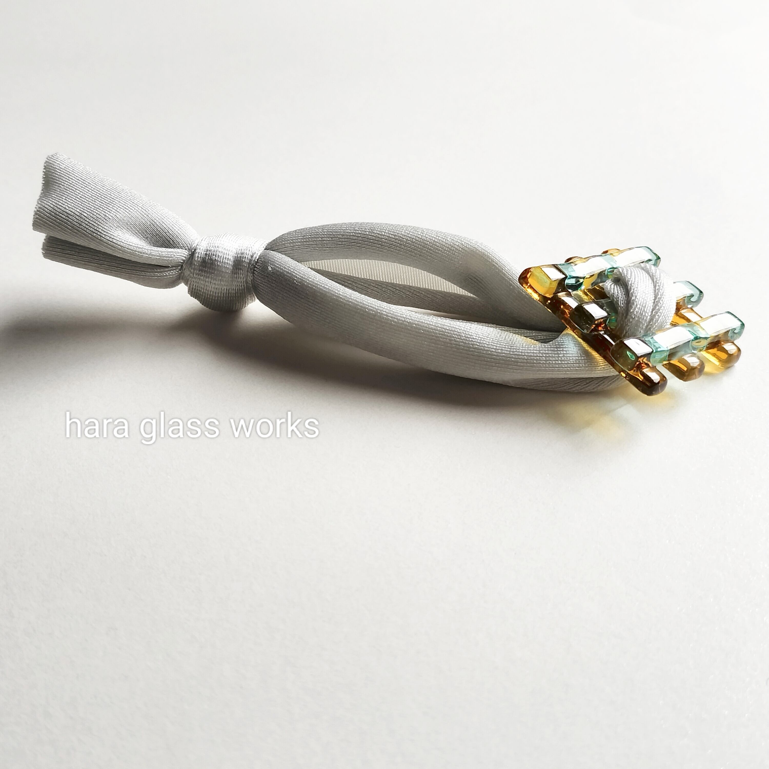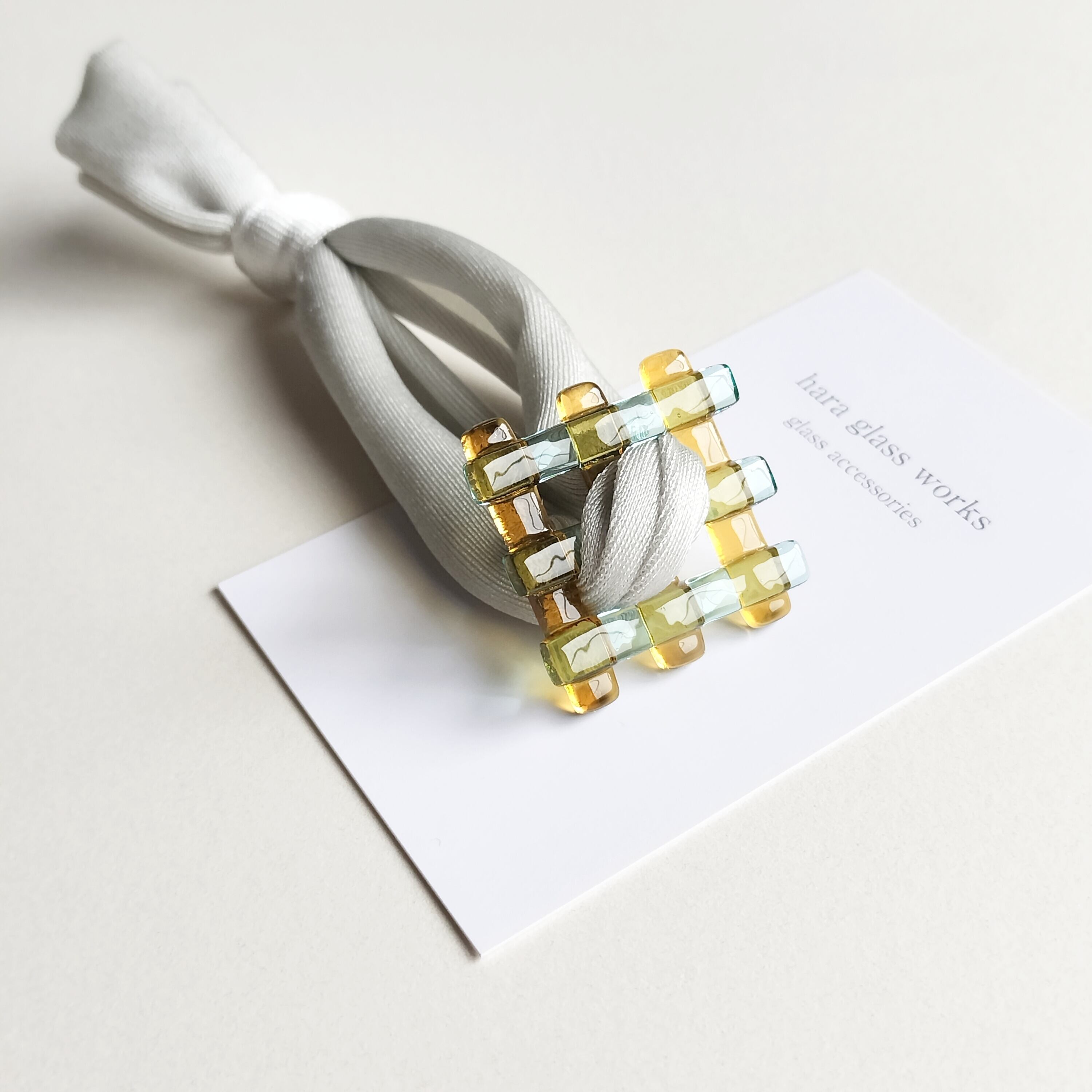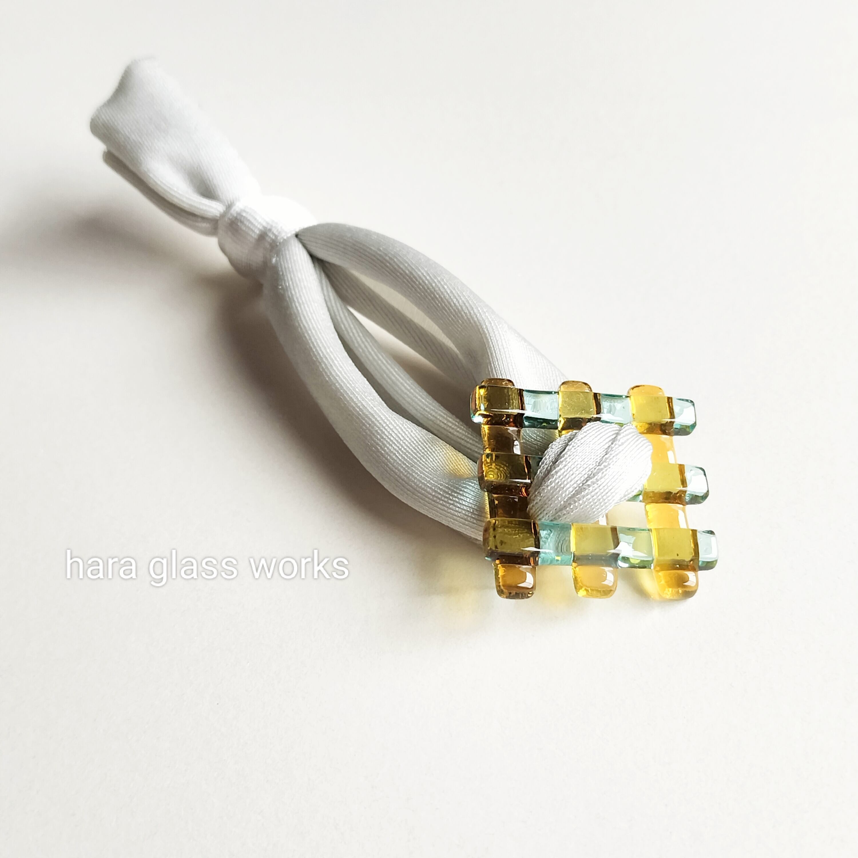 淡いカラーのティントブルー&キャメルがかわいいチェック(格子)ガラスのヘアゴムです。光沢と伸縮性のある布を割いてゴム部分に使いました。