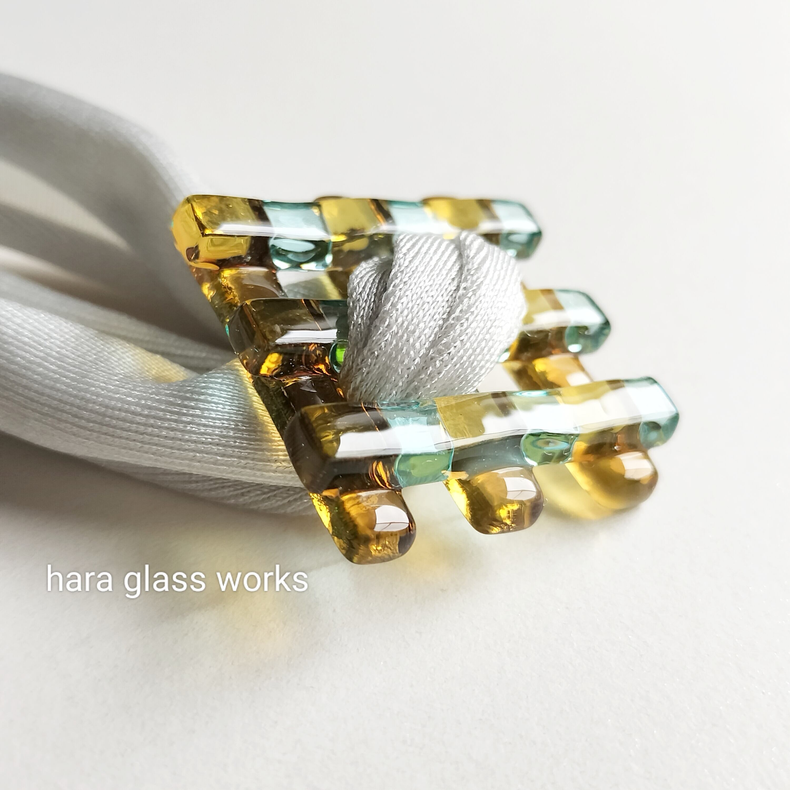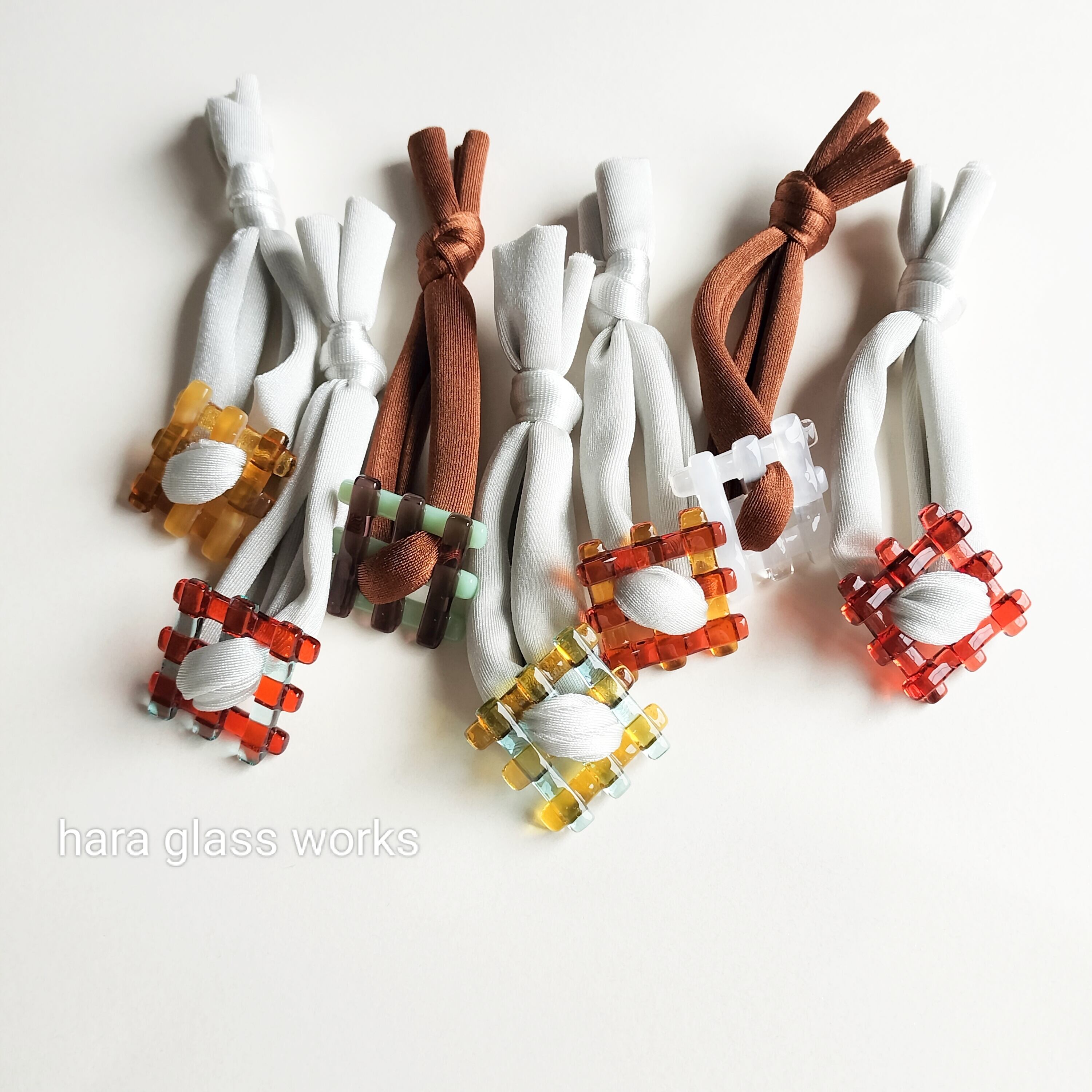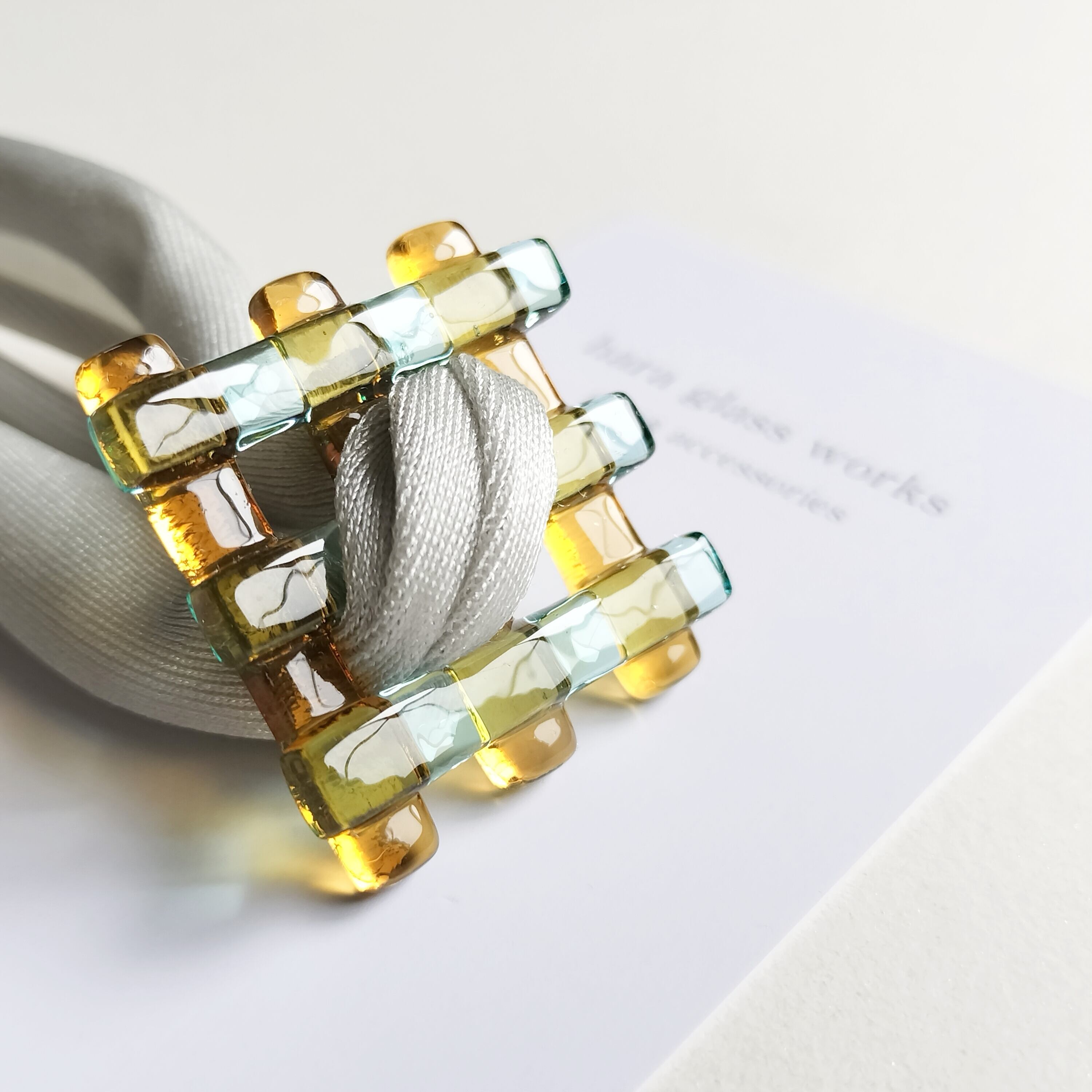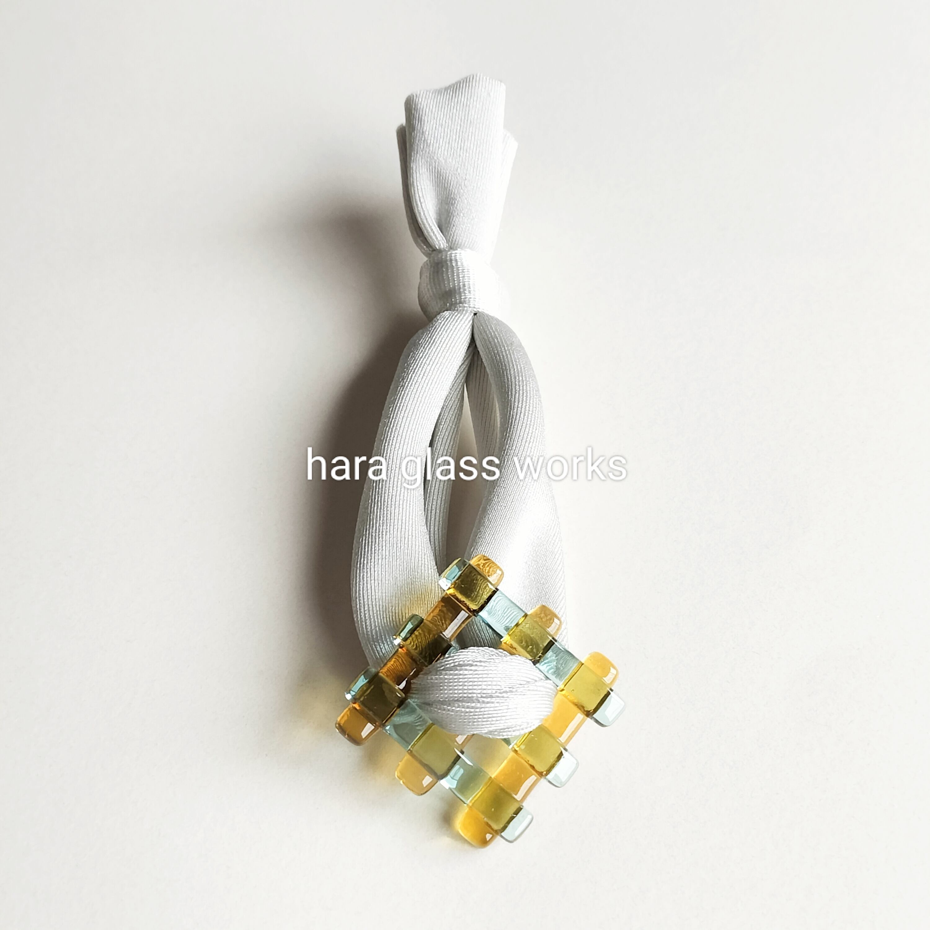 淡いカラーのティントブルー&キャメルがかわいいチェック(格子)ガラスのヘアゴムです。光沢と伸縮性のある布を割いてゴム部分に使いました。