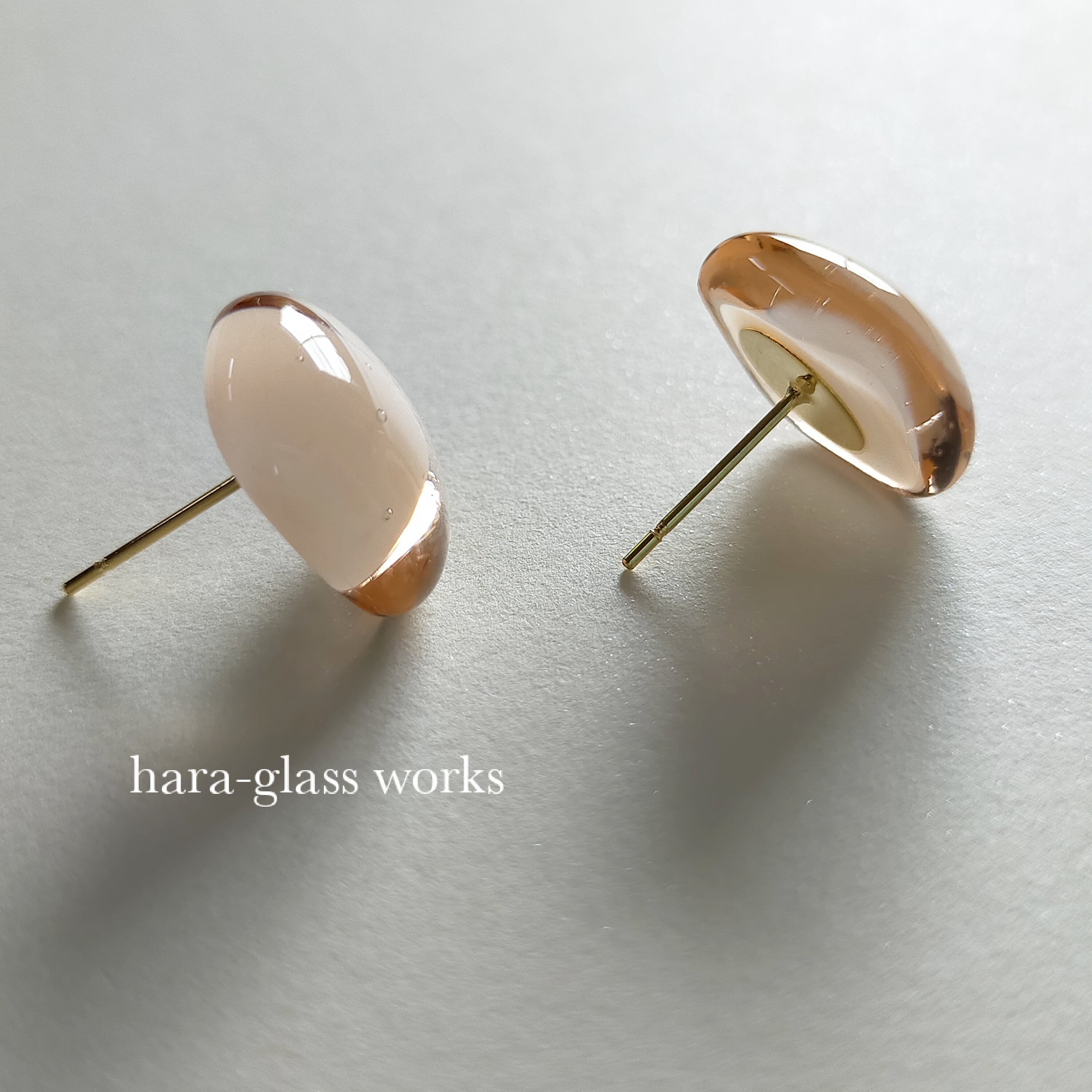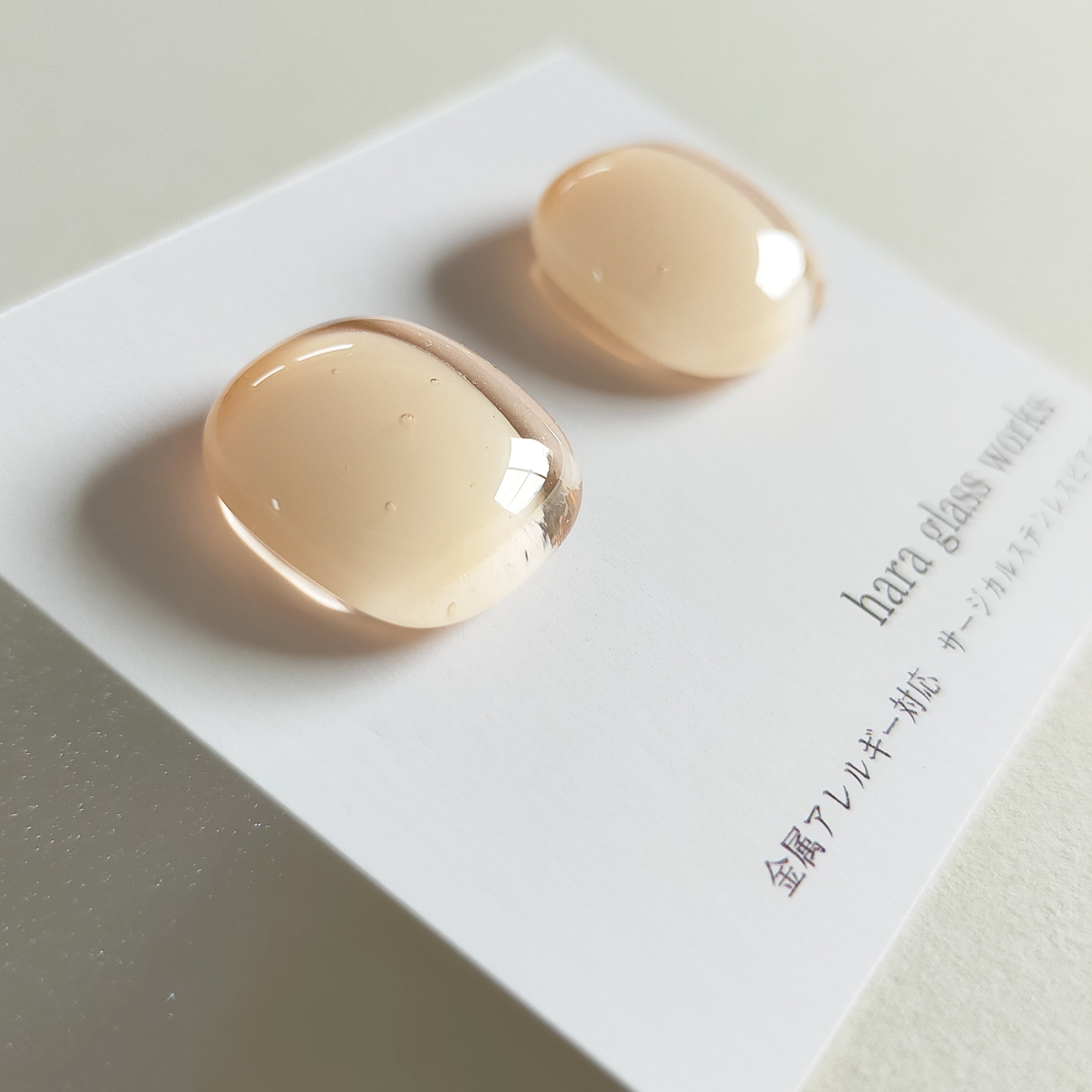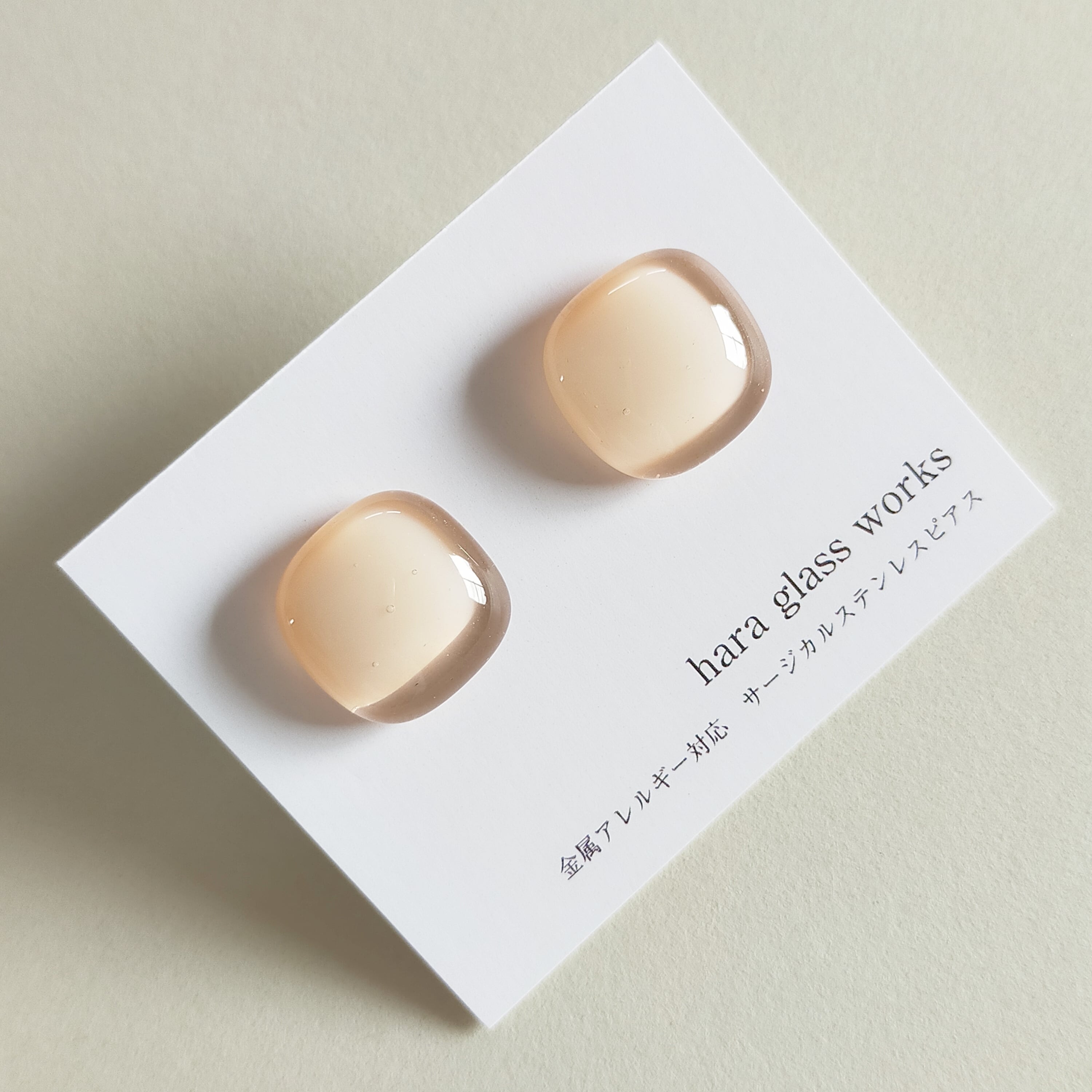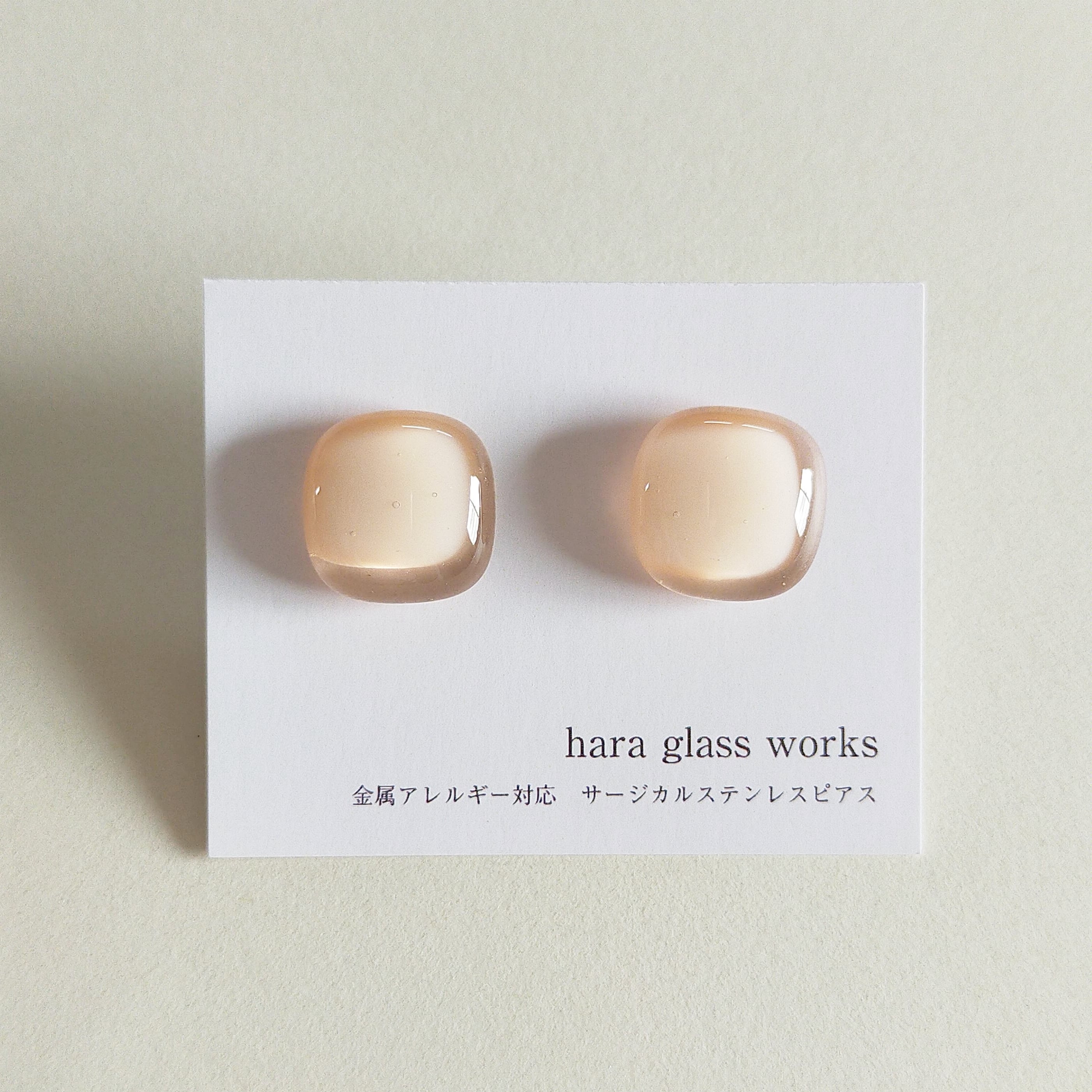 ふんわりスクエアのガラスアクセサリー ペールトーン ピンクベージュ アレルギー対応ピアス