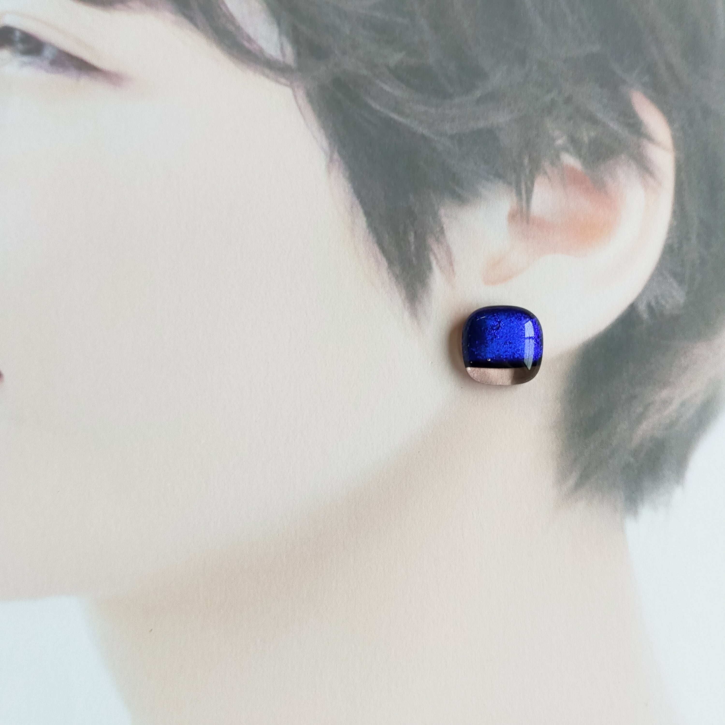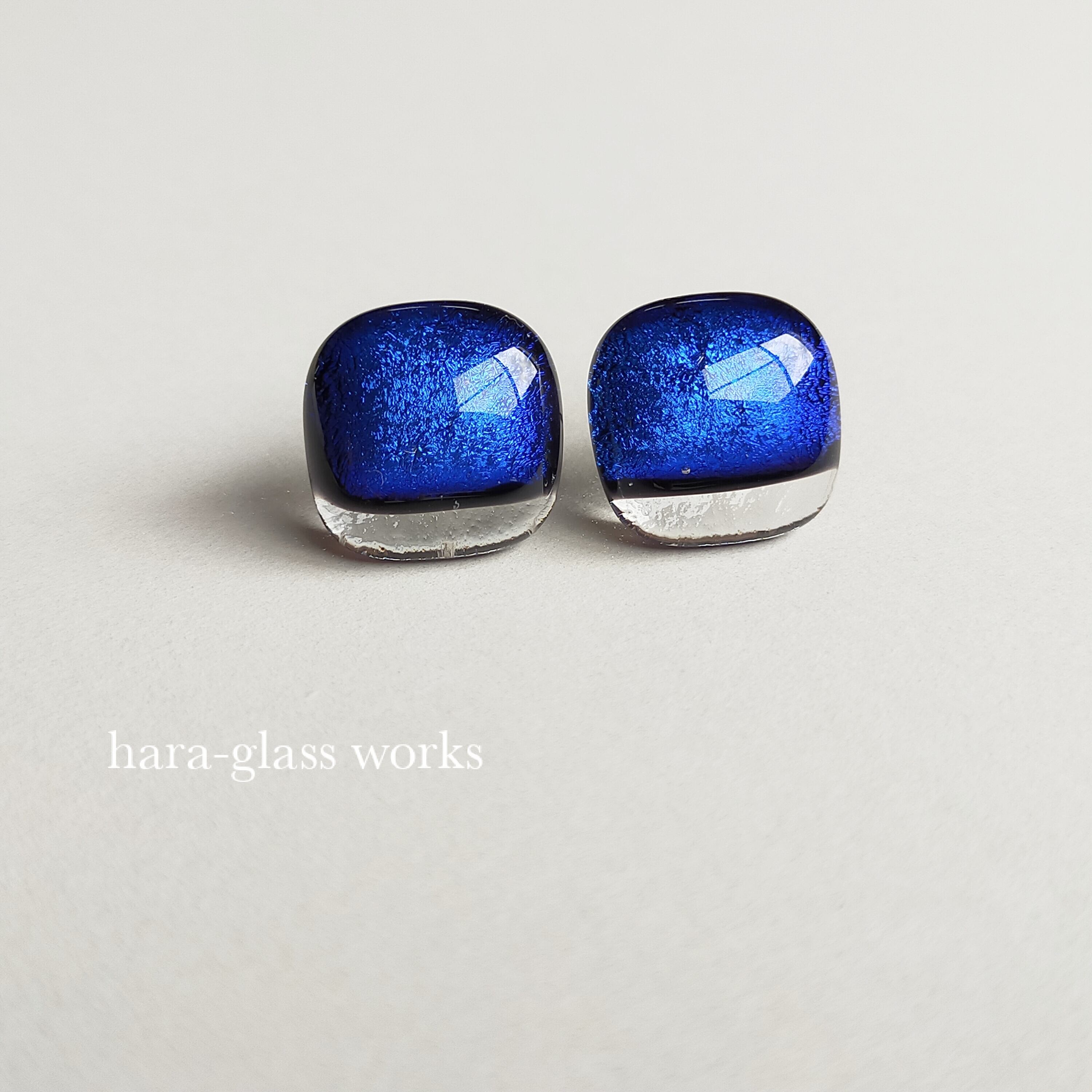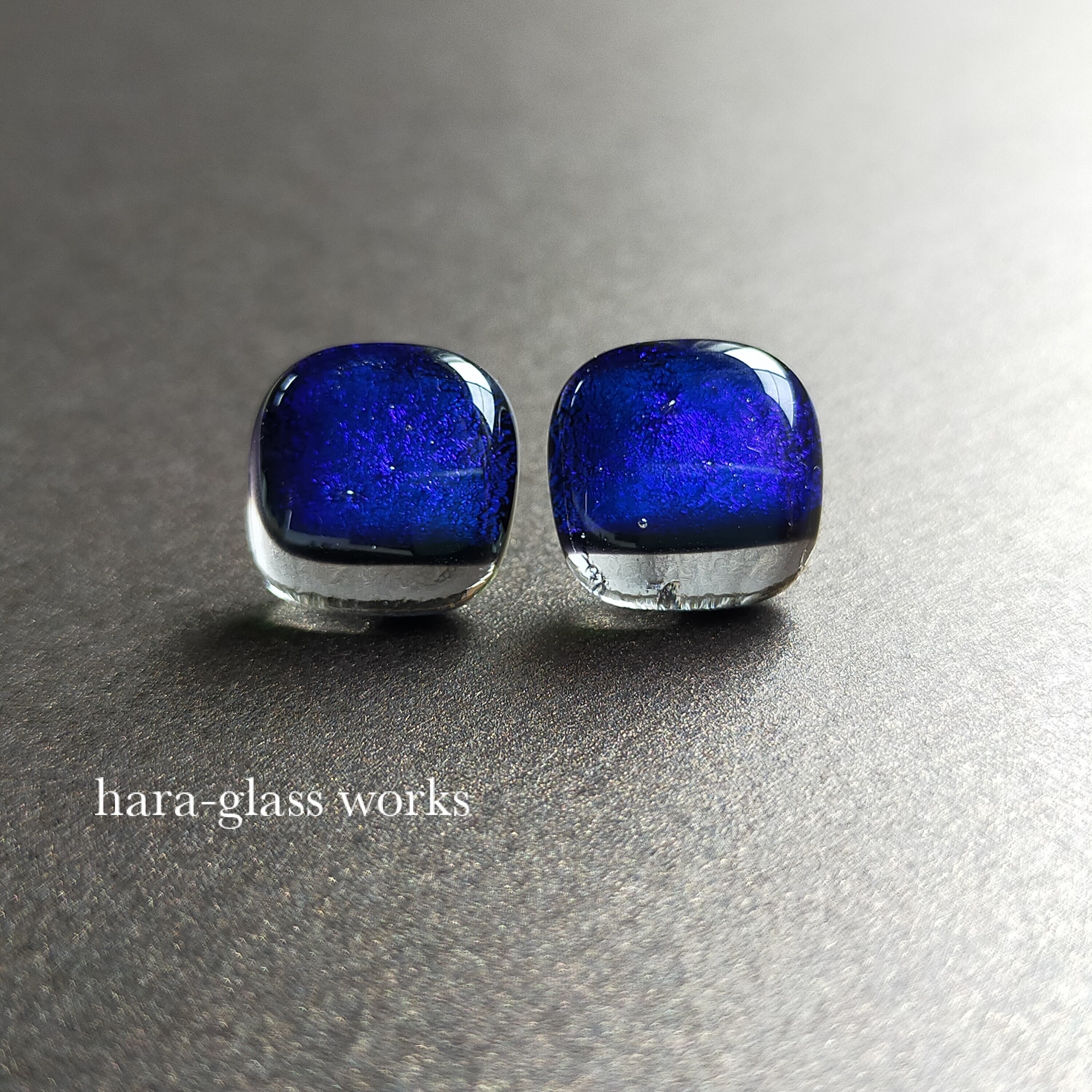 深い深い青色に輝くスクエアのガラスピアスです。