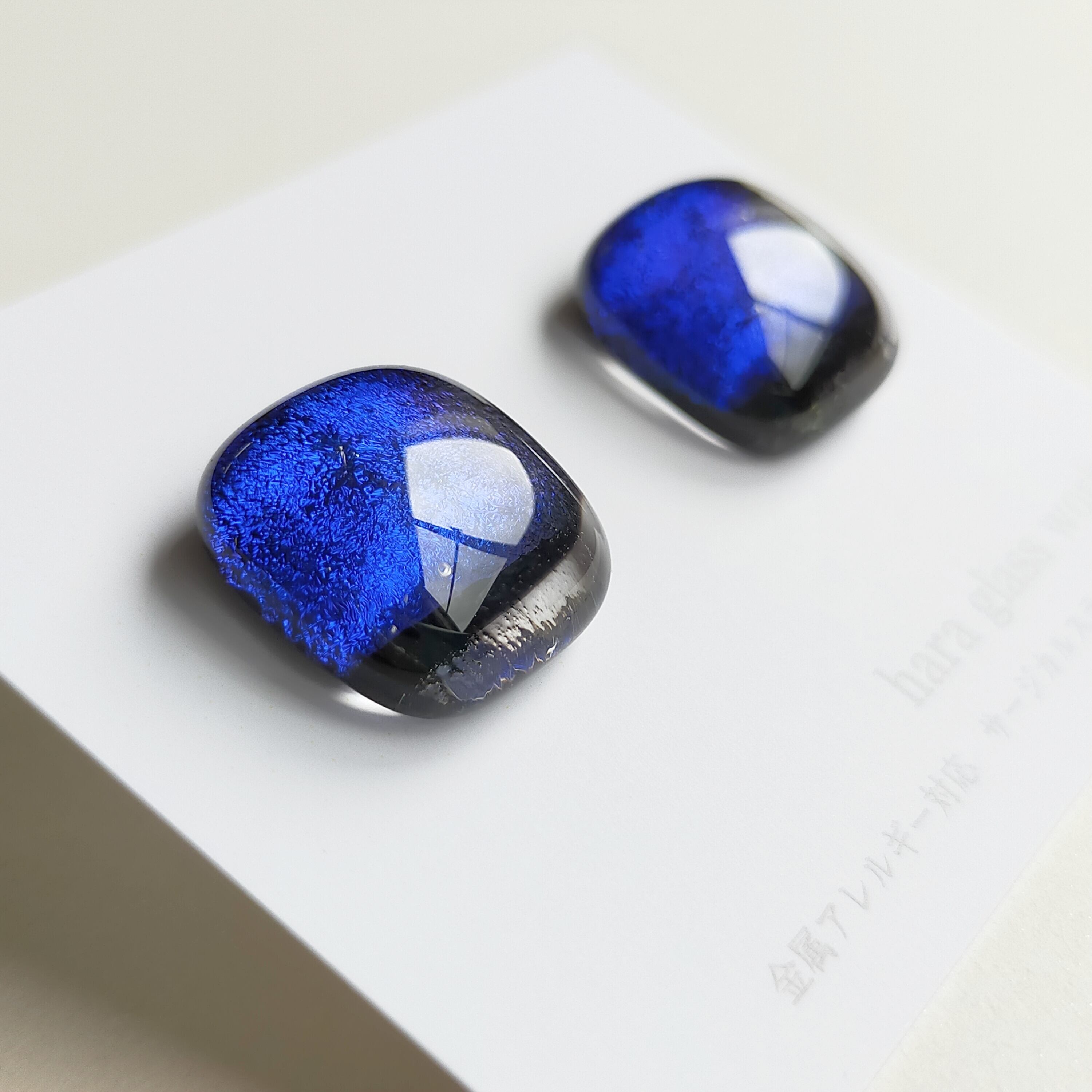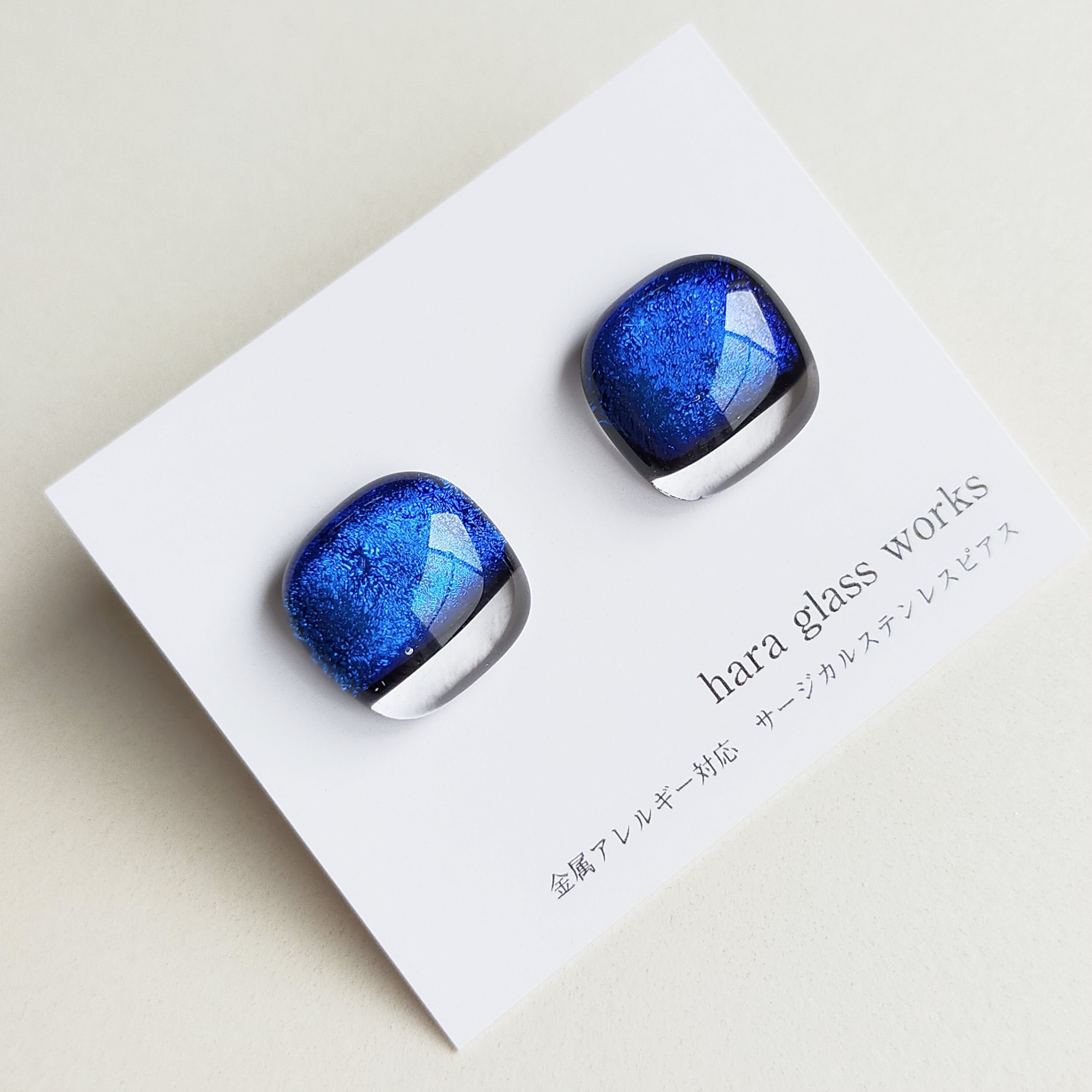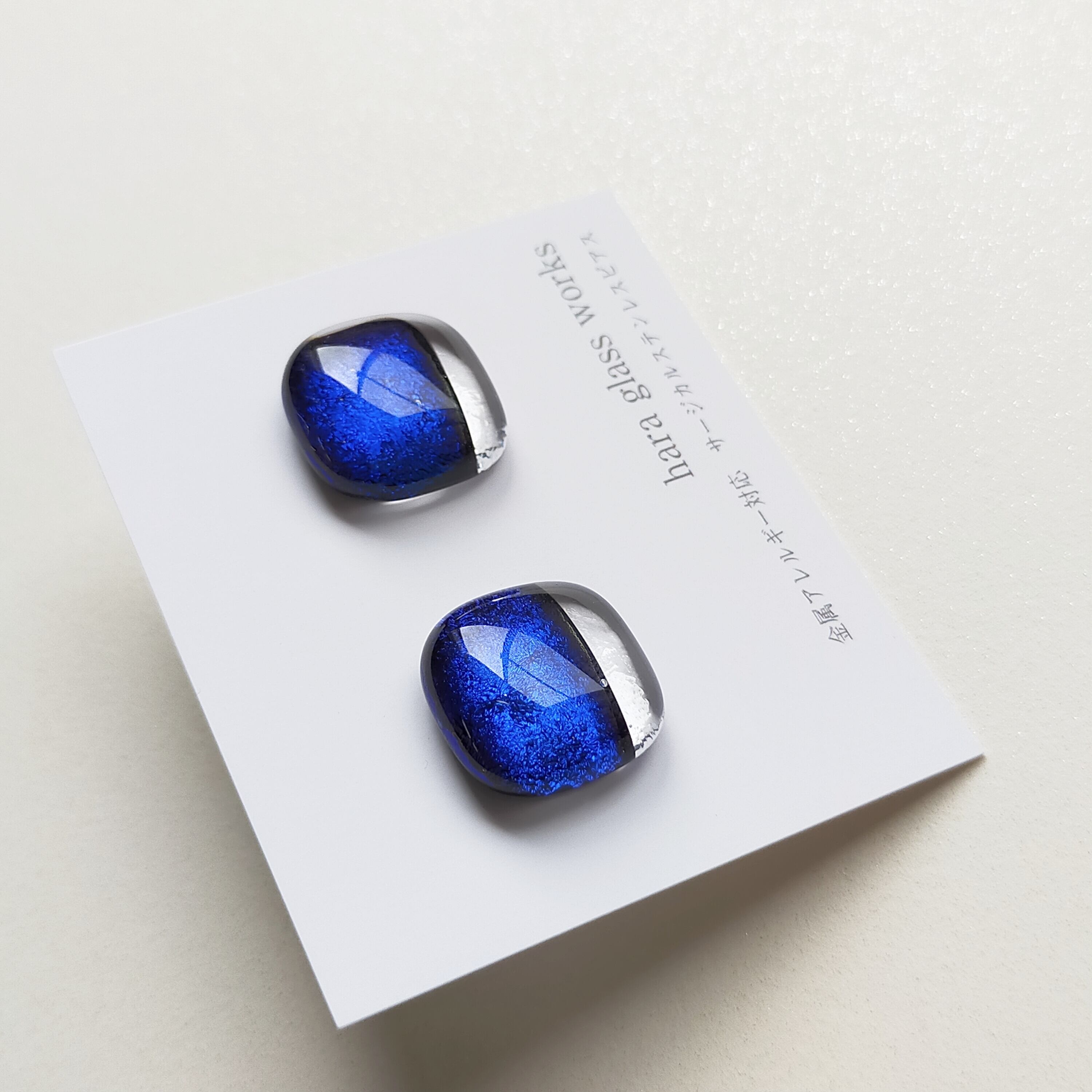 深い深い青色に輝くスクエアのガラスピアスです。