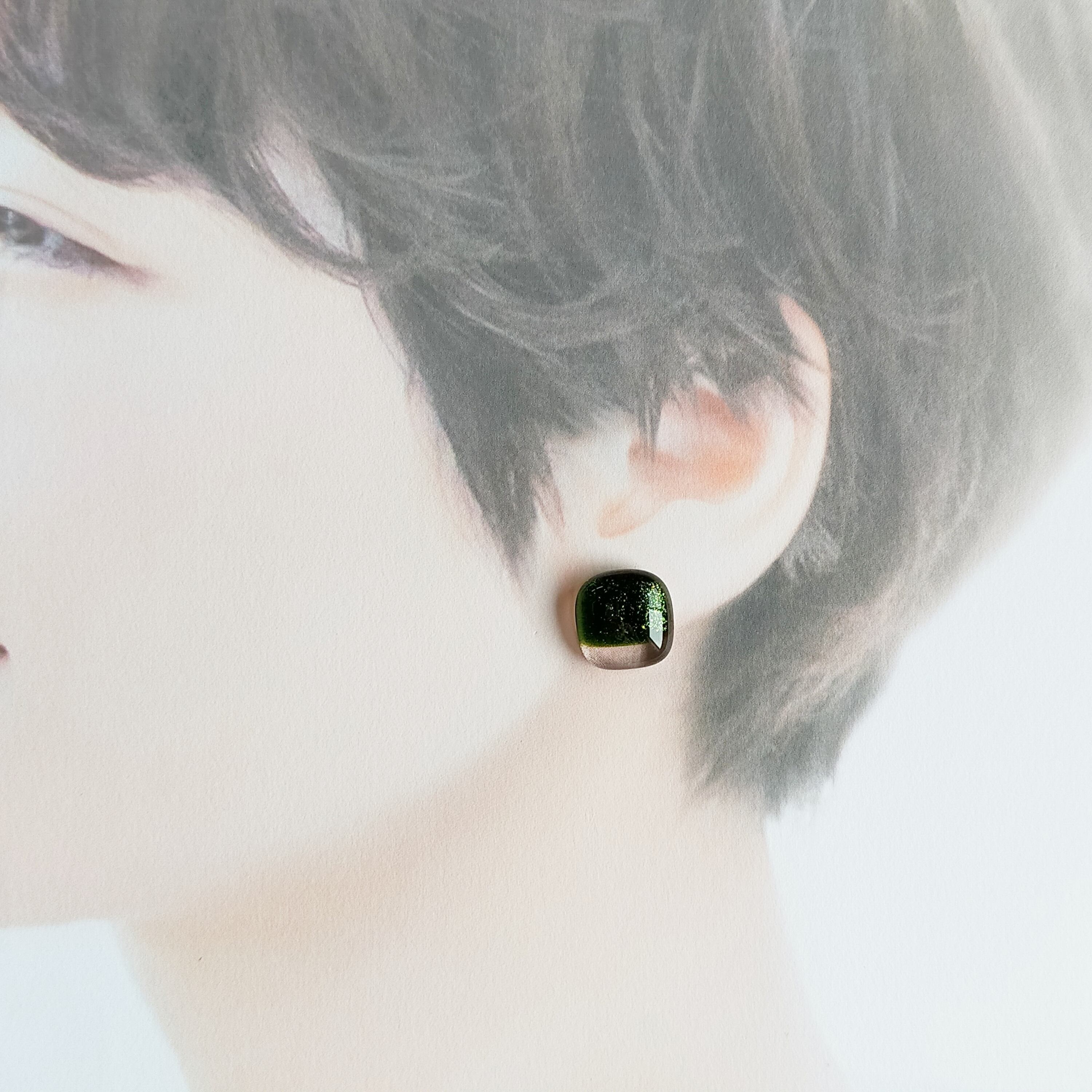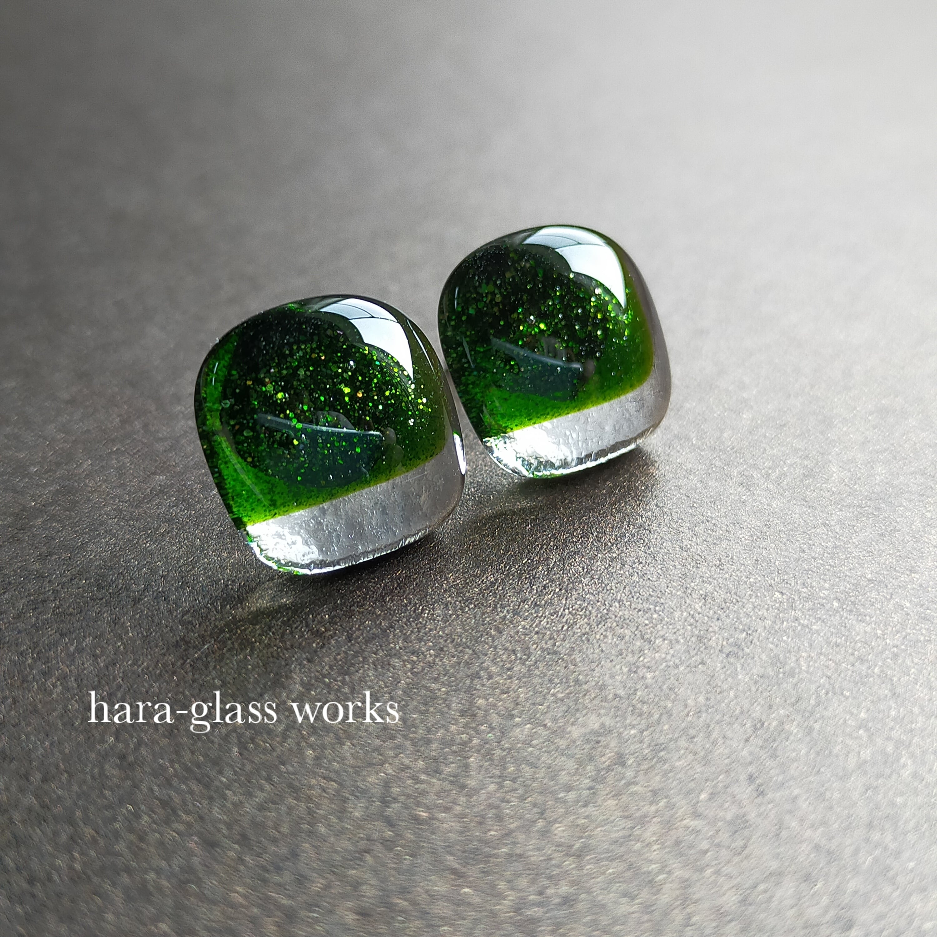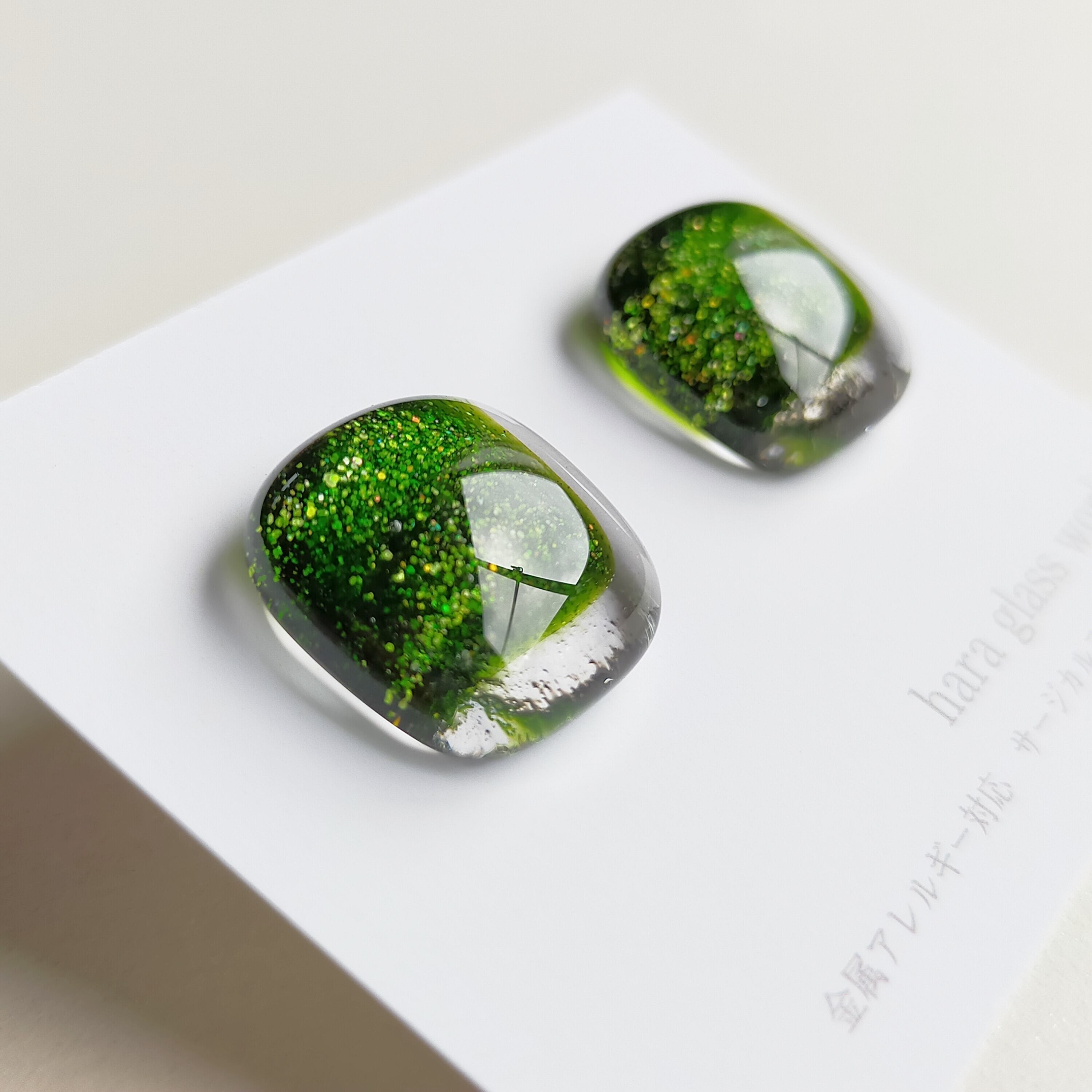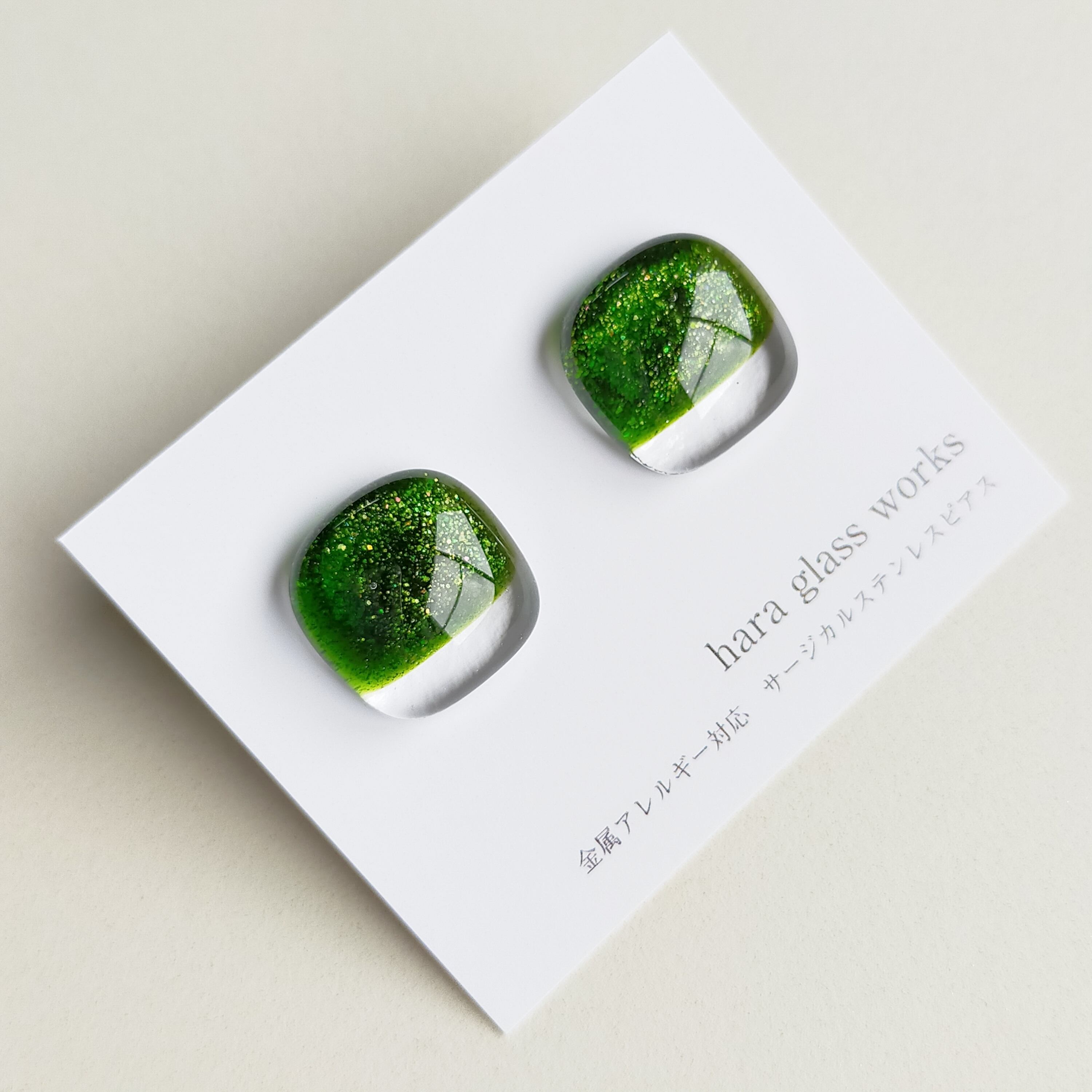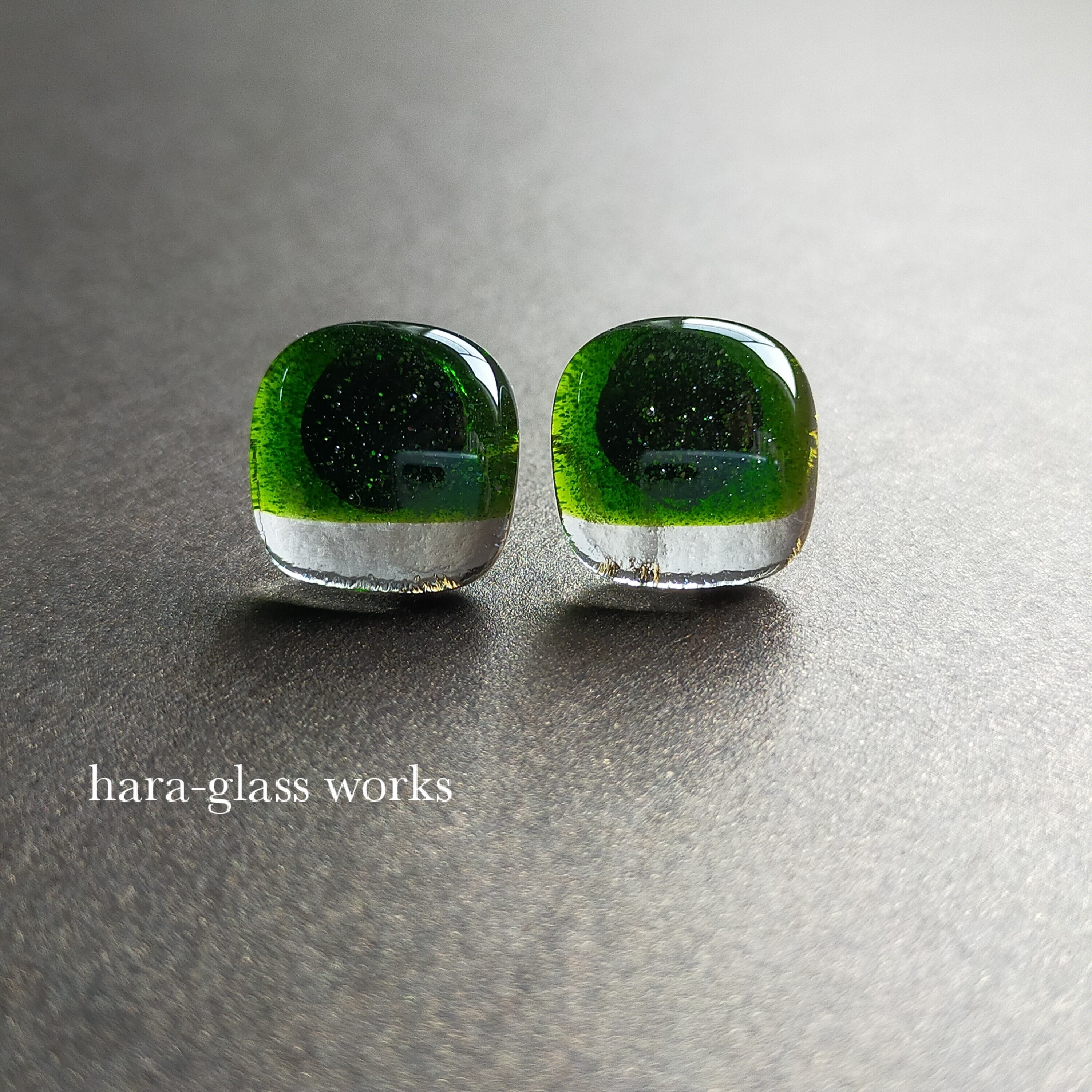ふんわりスクエアのガラス グリーンアベンチュリン 【アレルギー対応ピアス】