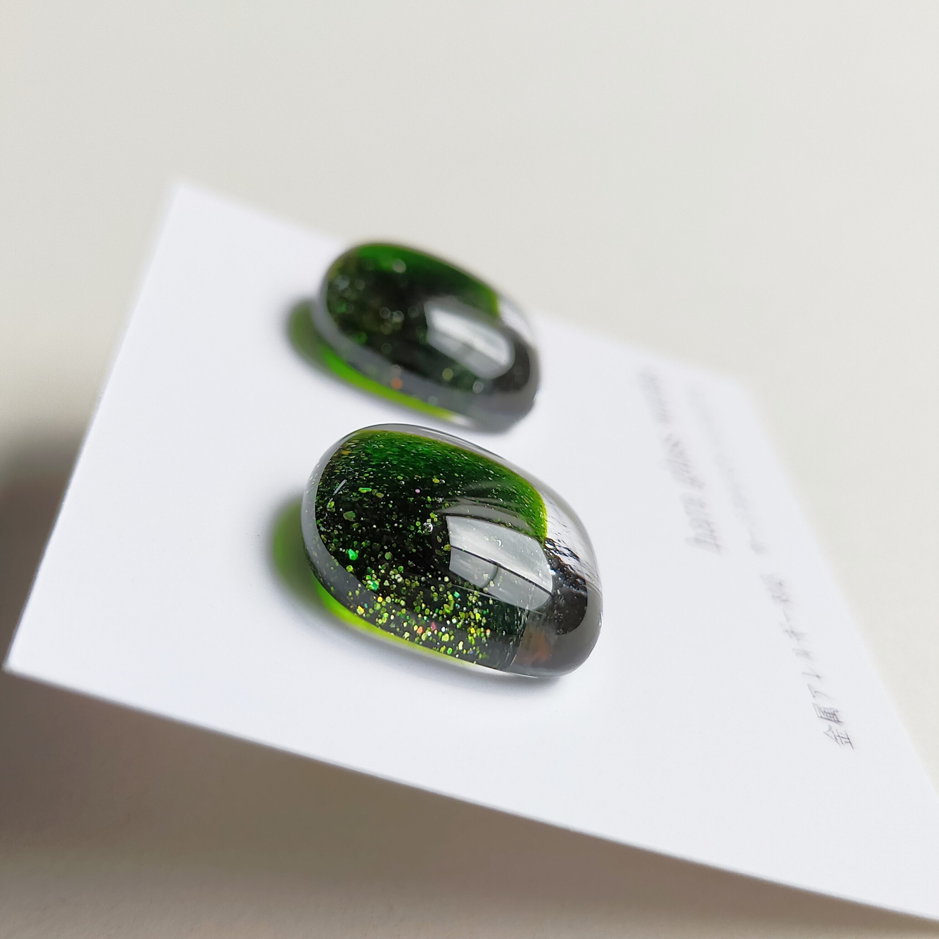 グリーンをベースにしたキラキラの粒が、動きに合わせて光りとても印象的です。サイドからのぞくクリアガラスとのコントラストを楽しんで頂きたい作品です。