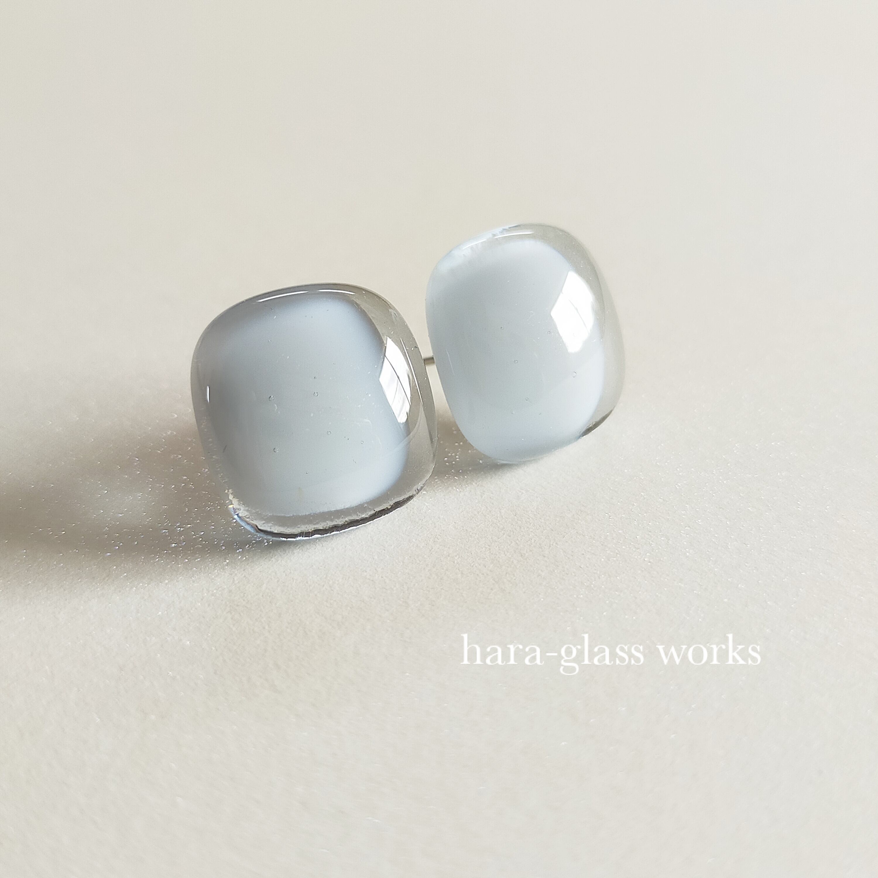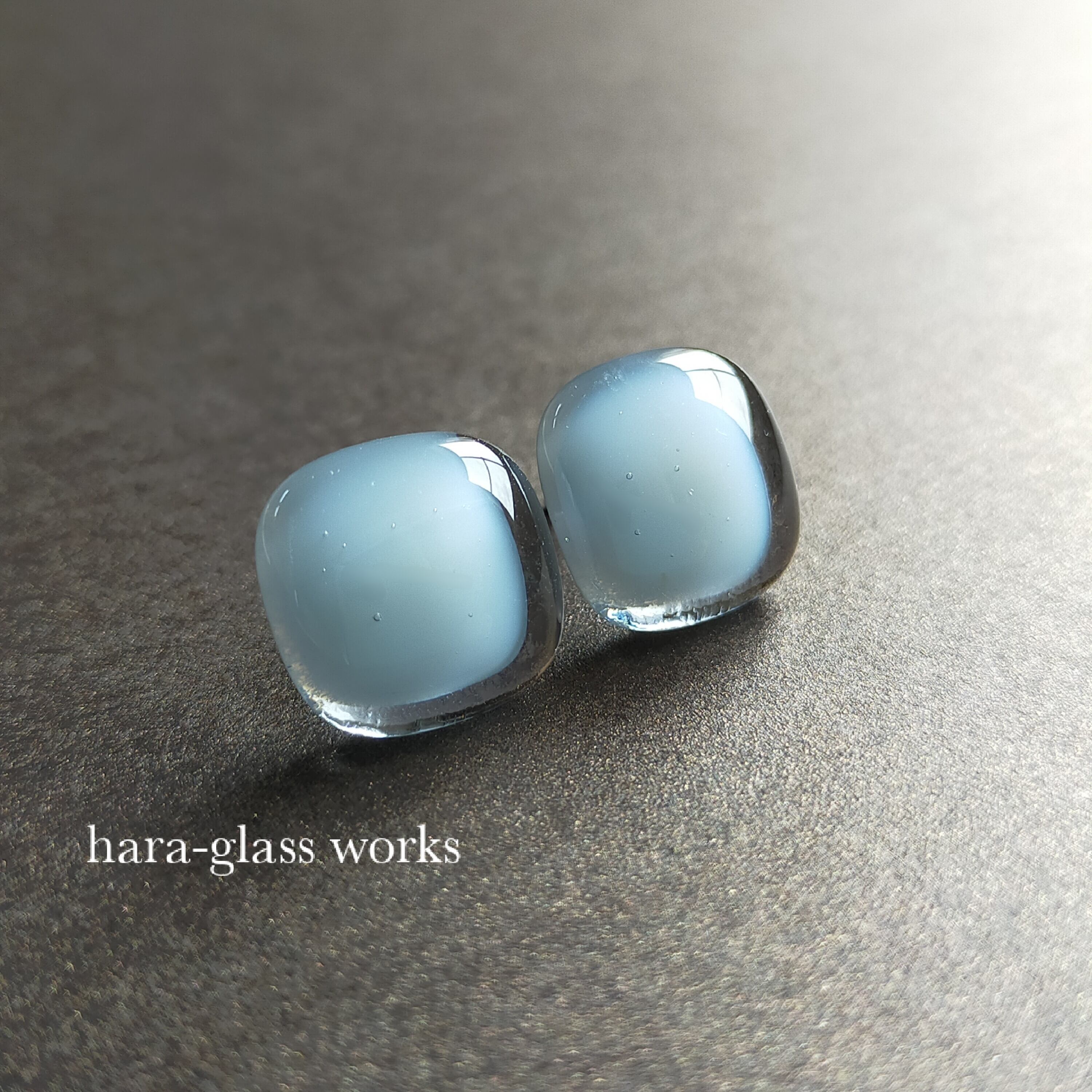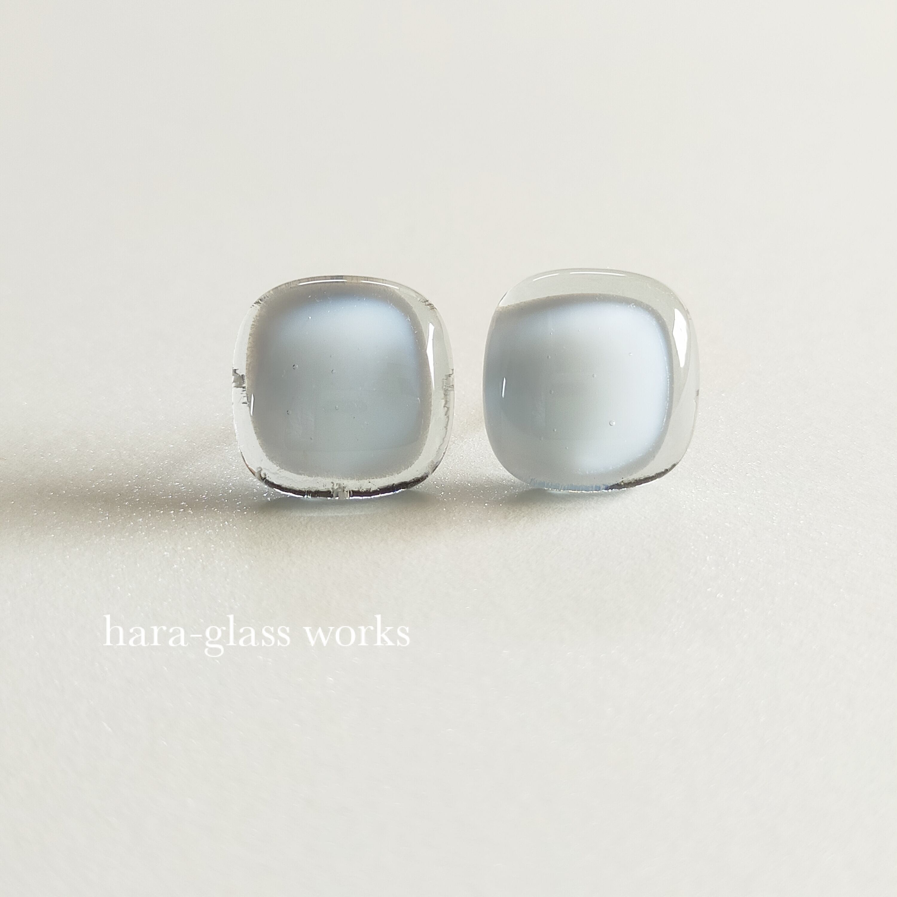 柔らかいスクエアの形をしたガラスアクセサリーです。淡いカラーのティントネイビーとホワイトを重ね、透明感の美しいガラスにしました。