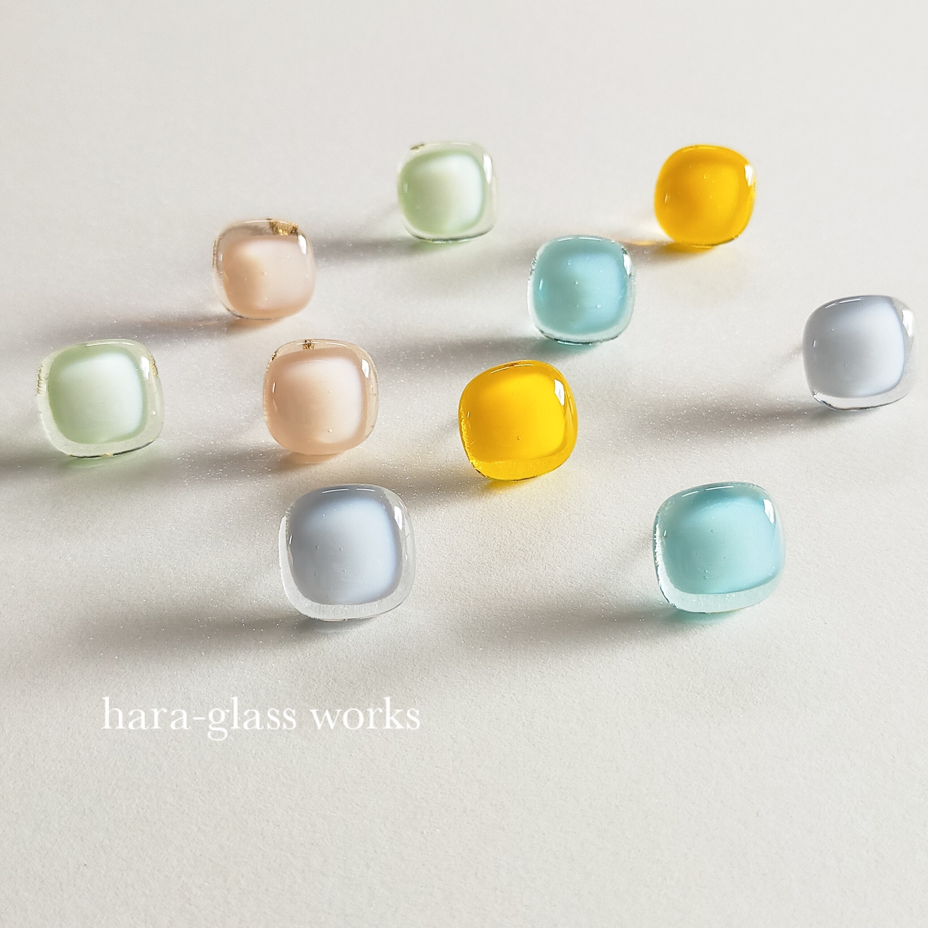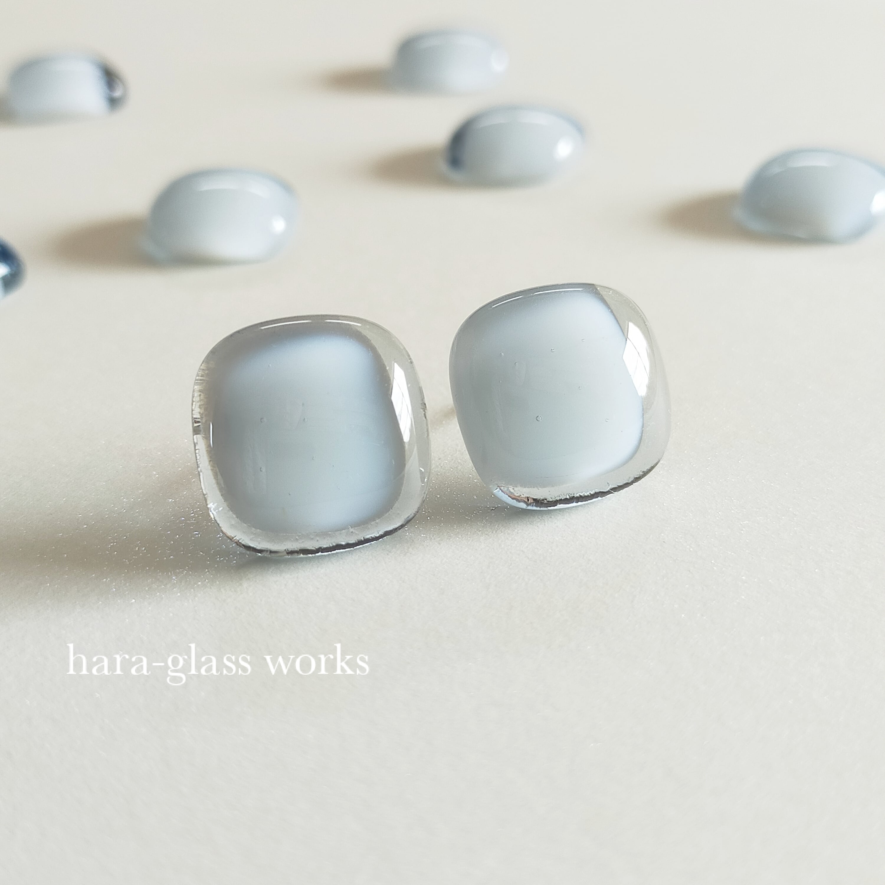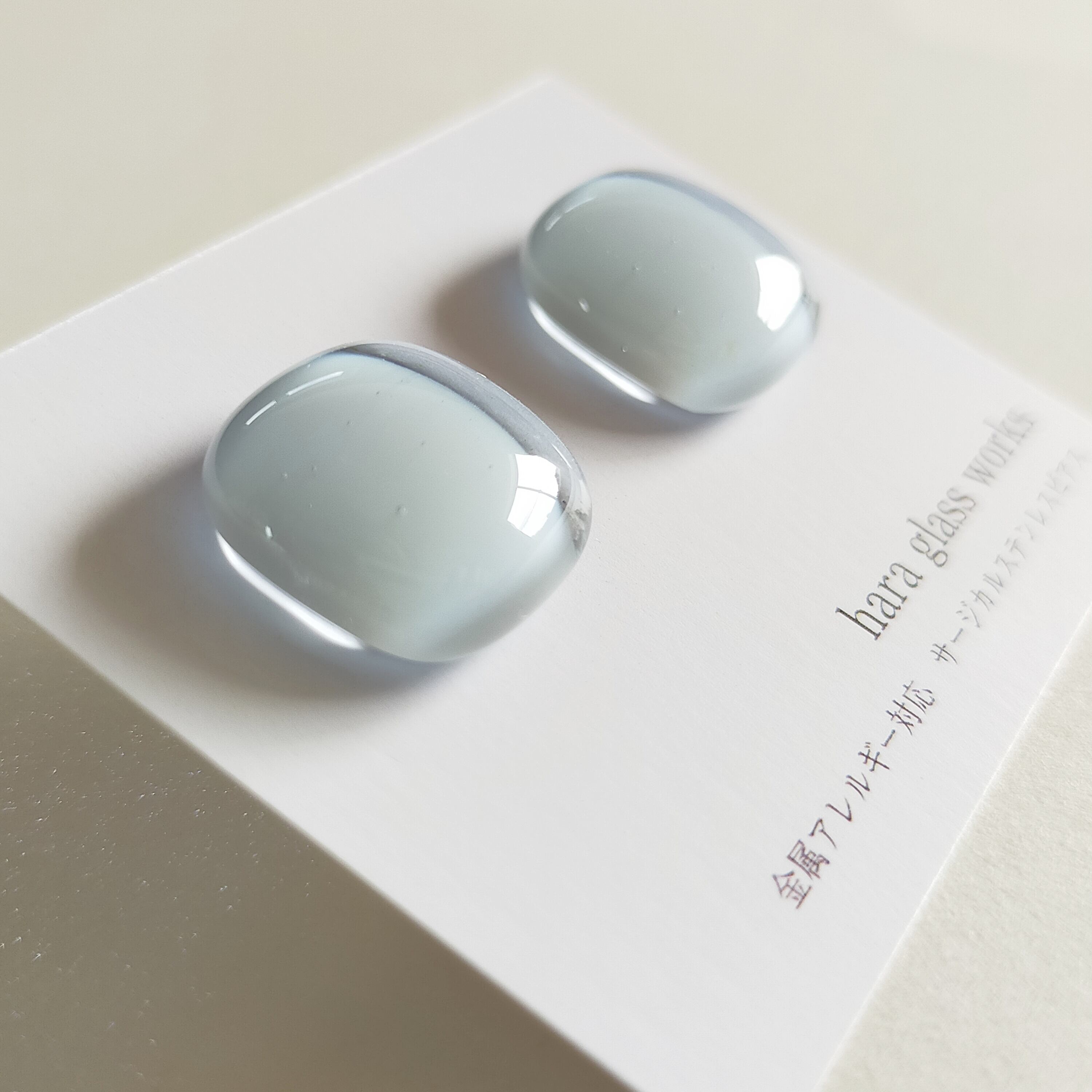 柔らかいスクエアの形をしたガラスアクセサリーです。淡いカラーのティントネイビーとホワイトを重ね、透明感の美しいガラスにしました。