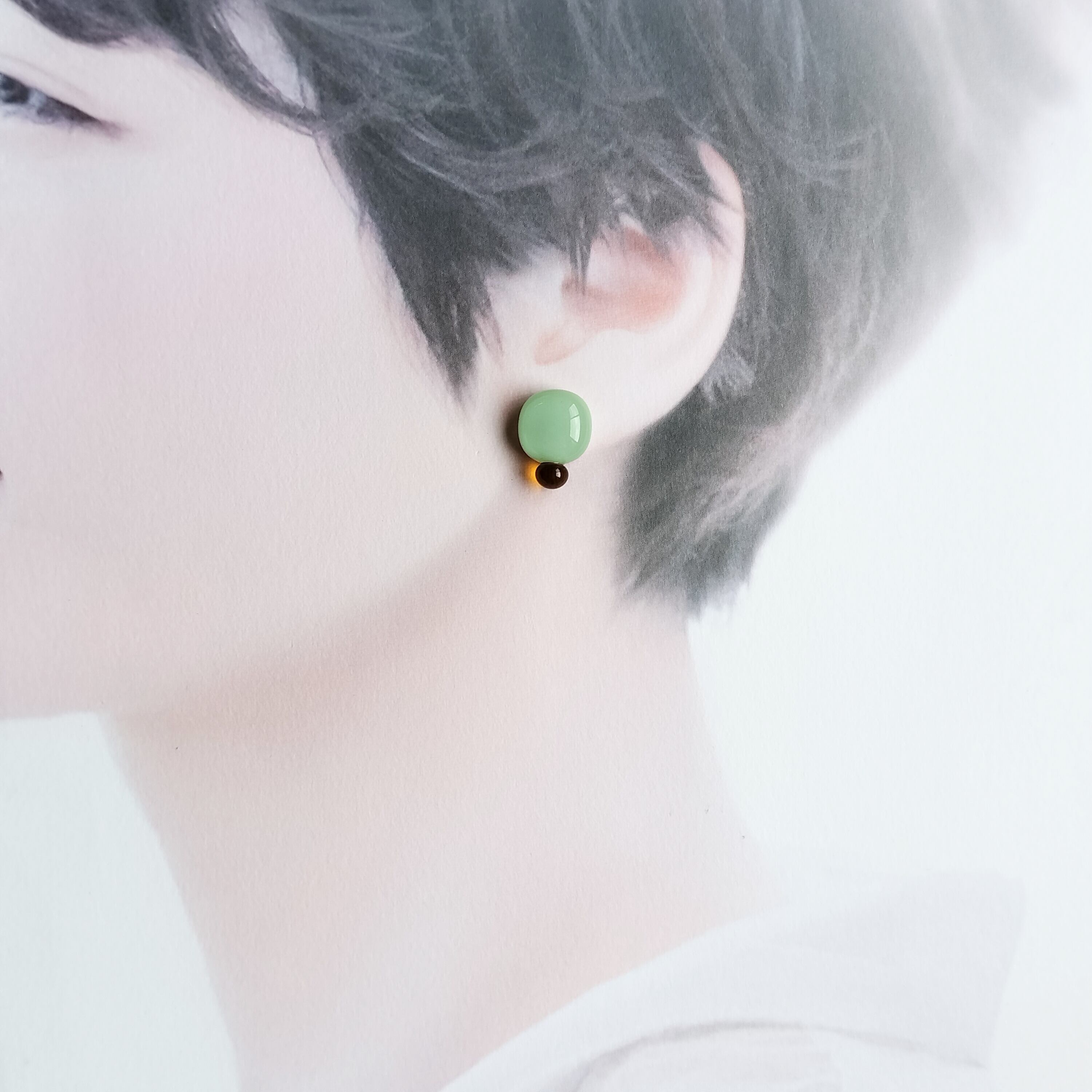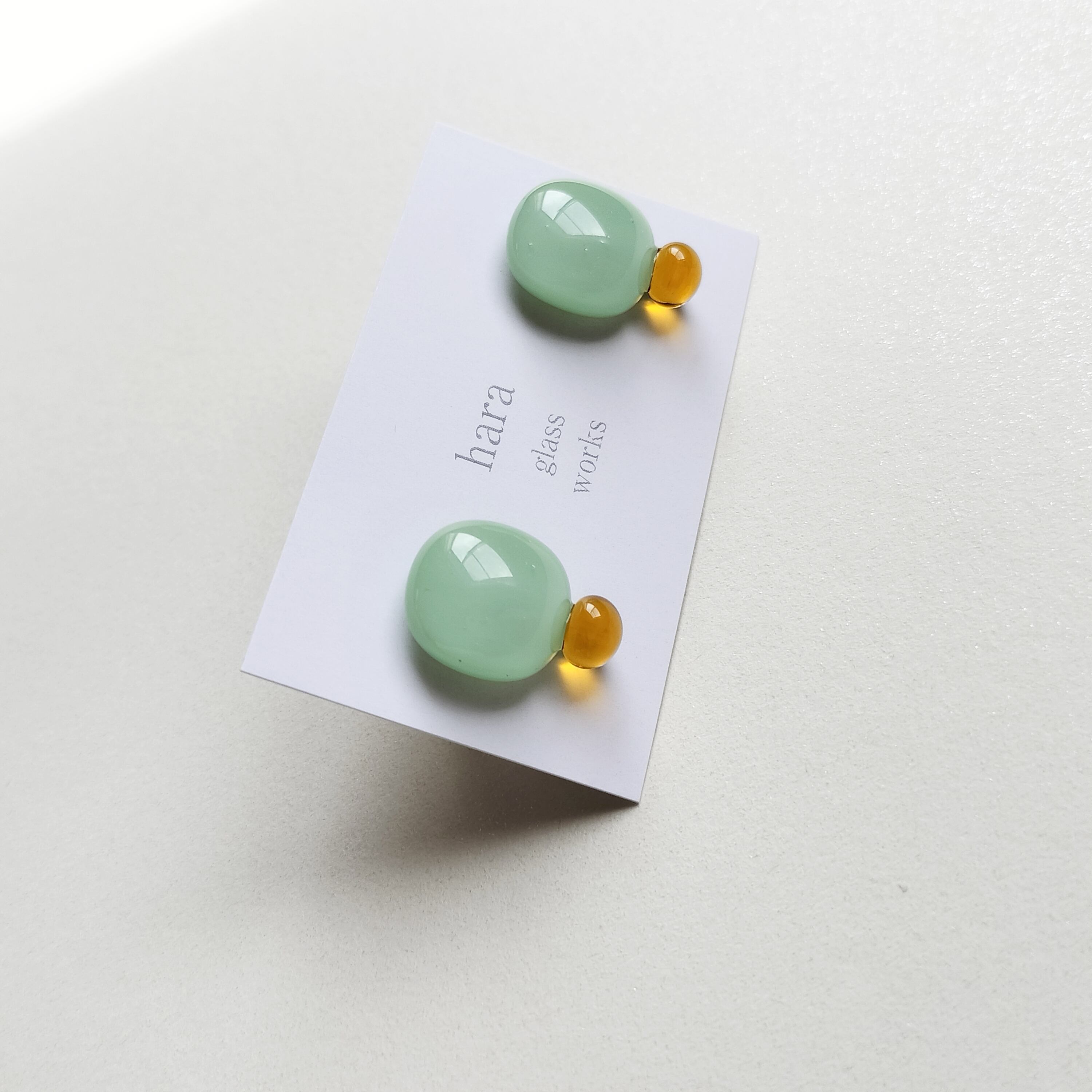 ガラスの2粒ピアス ミントグリーン&透明キャメル アレルギー対応ピアス