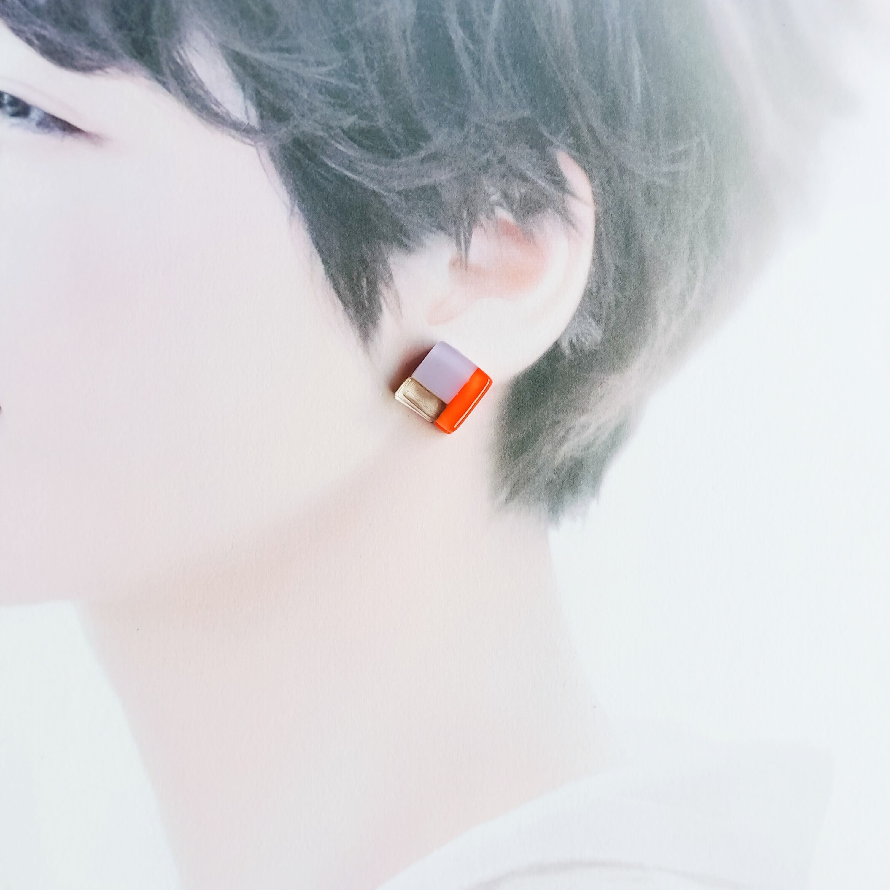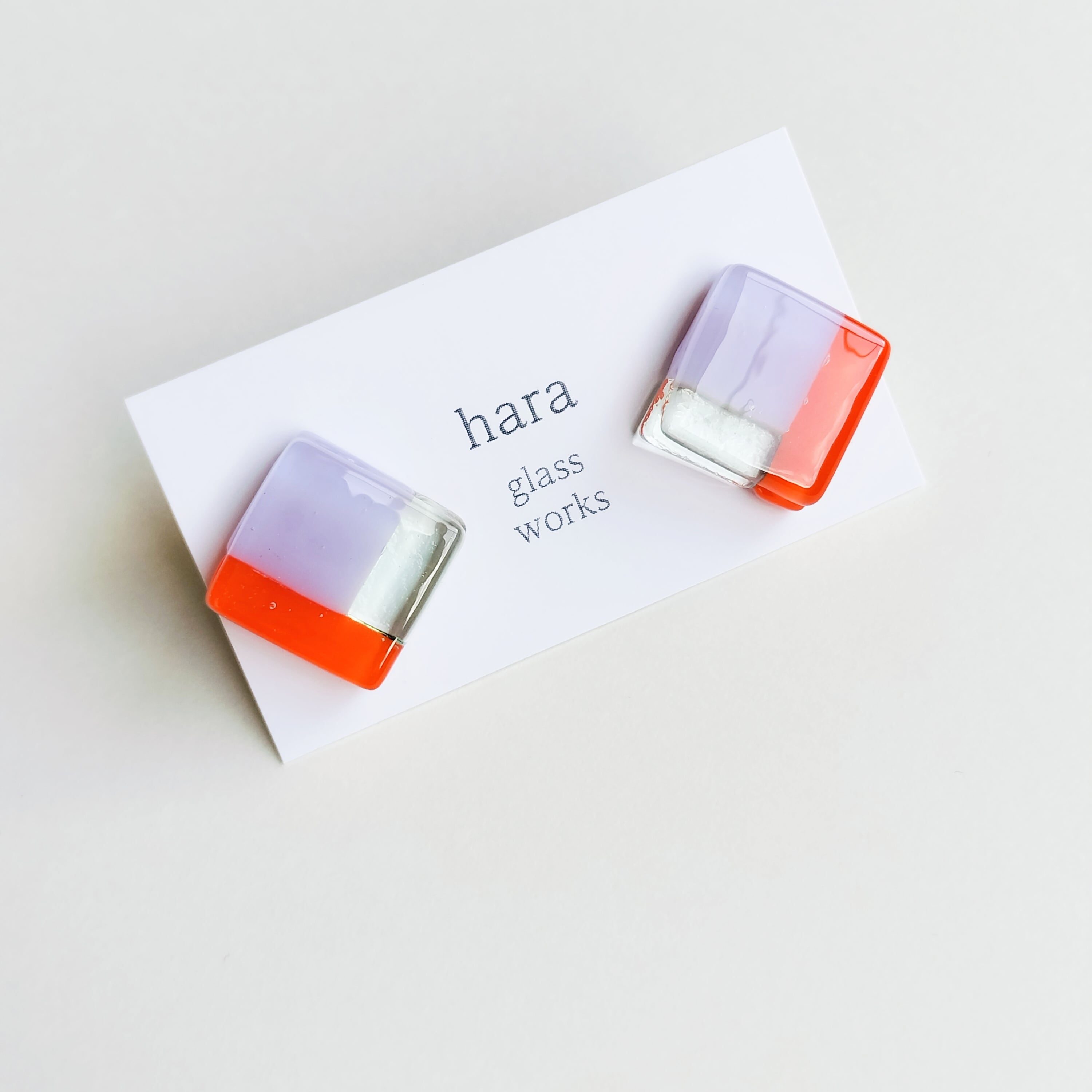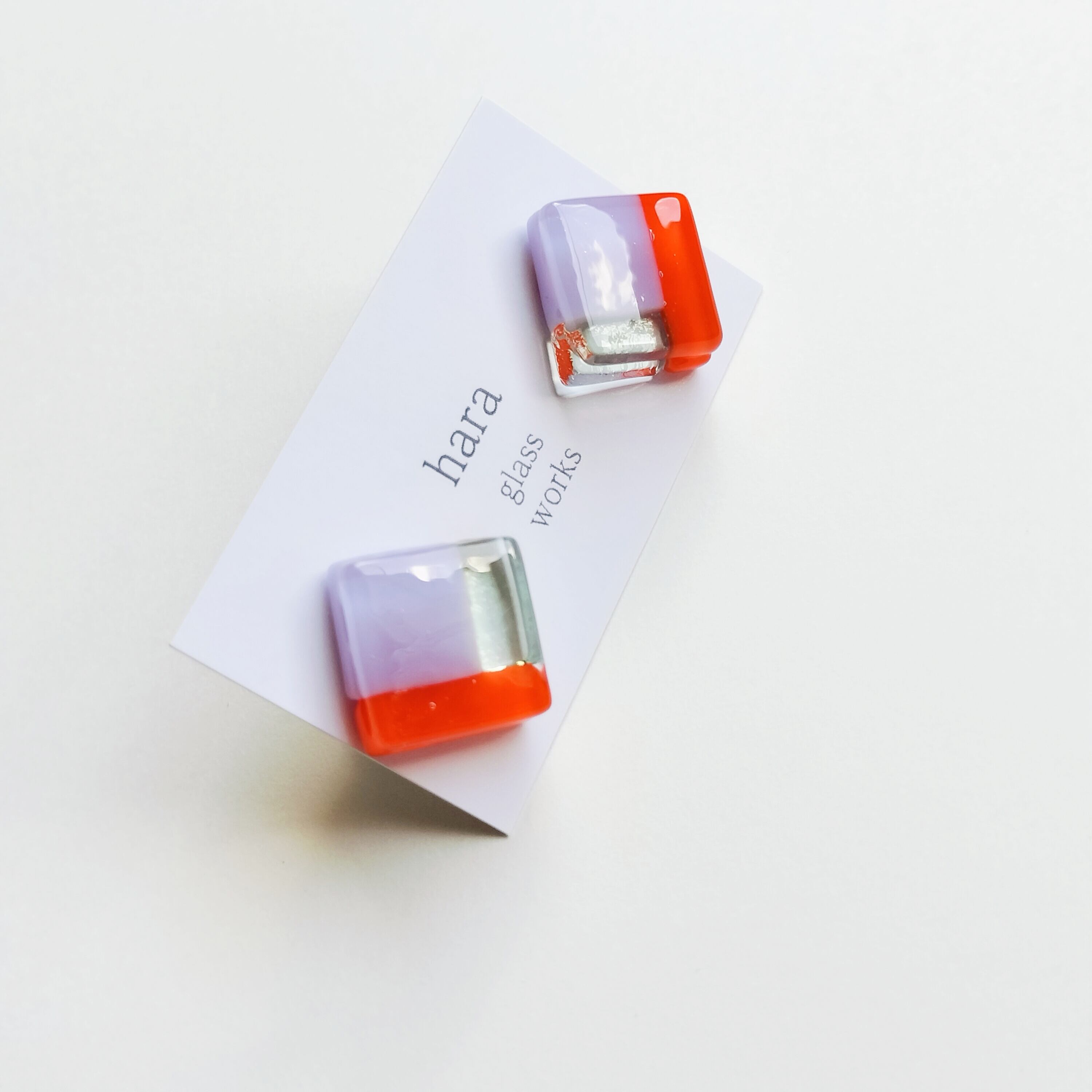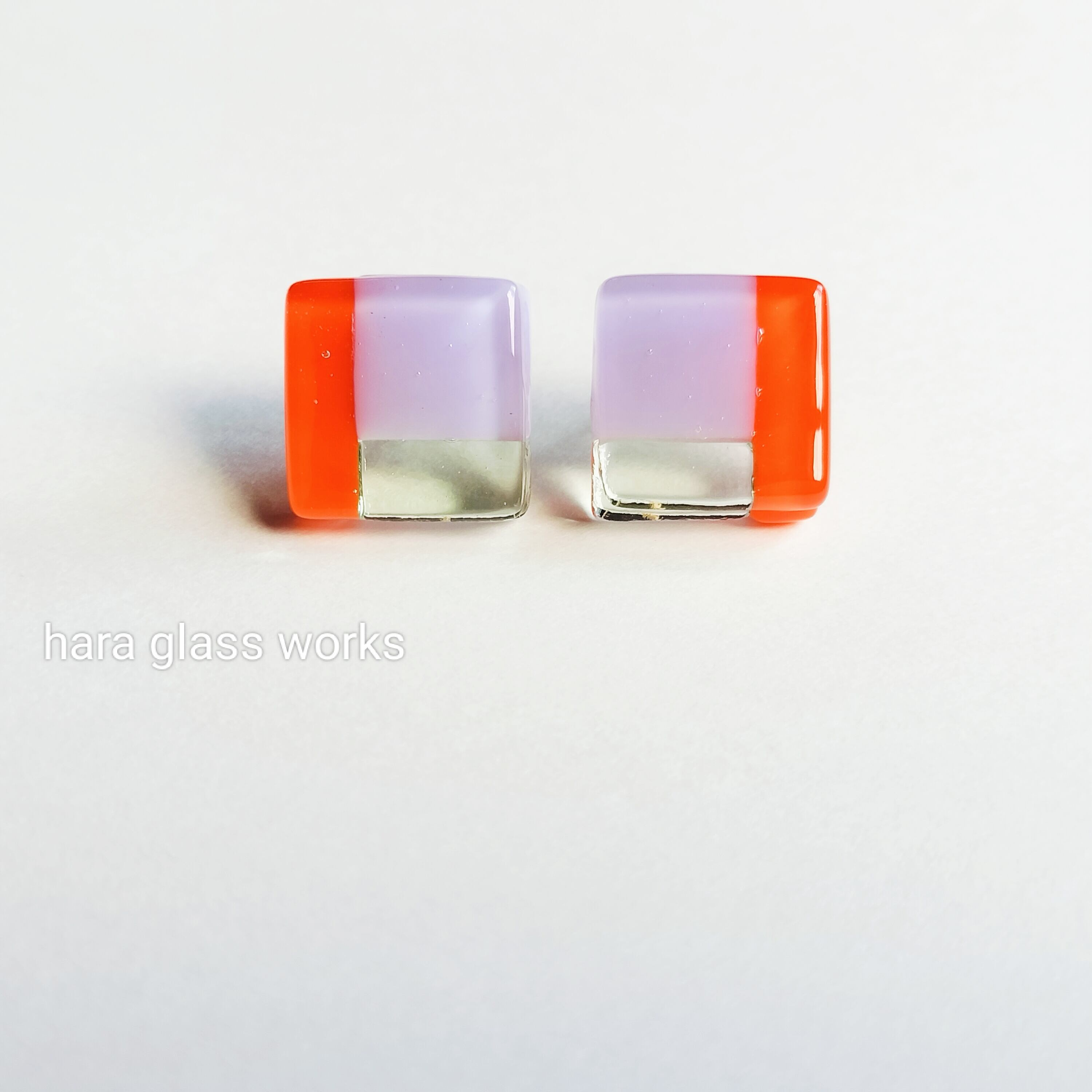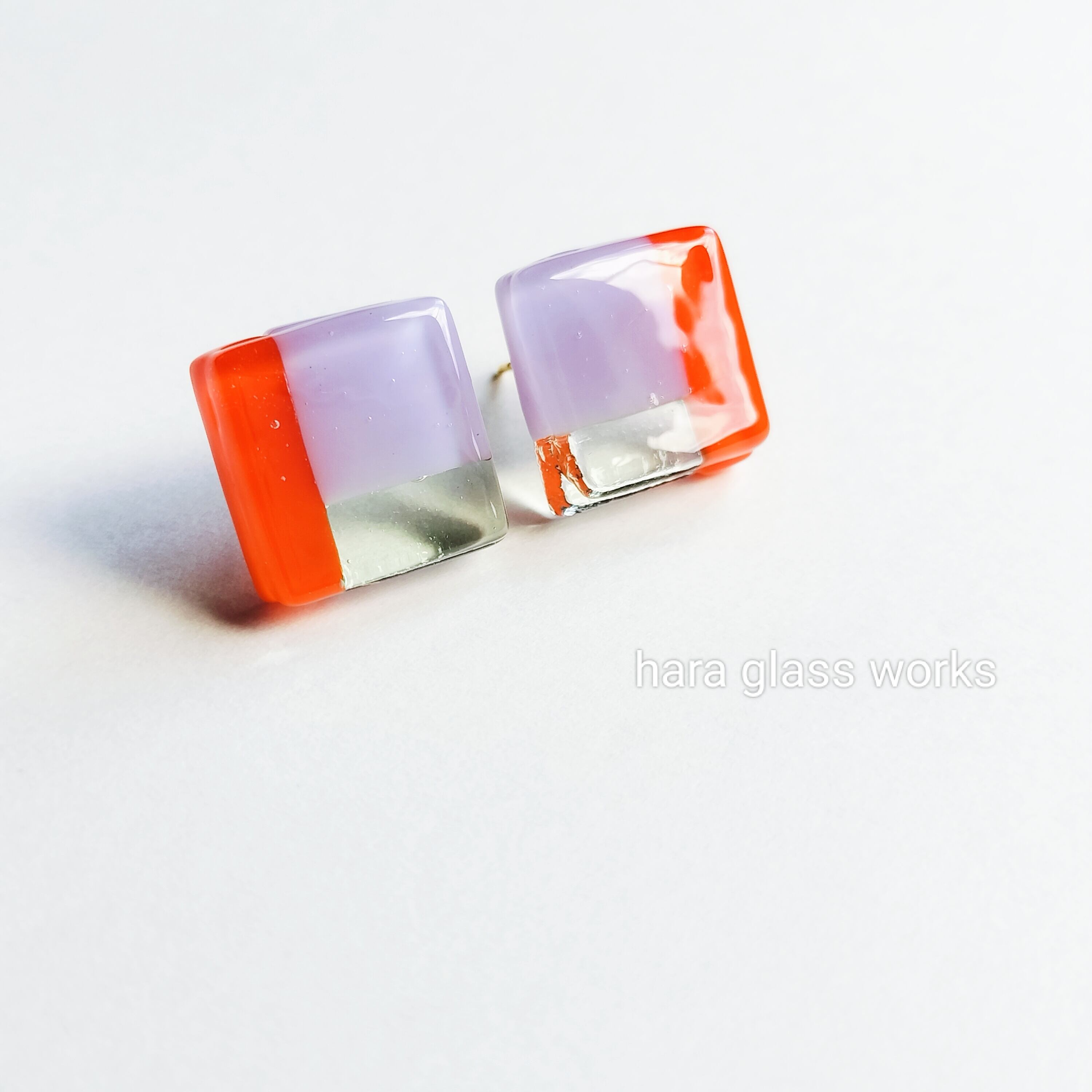 トリコロールのスクエアガラス ラベンダー&オレンジ&ティントグリーン アレルギー対応ピアス